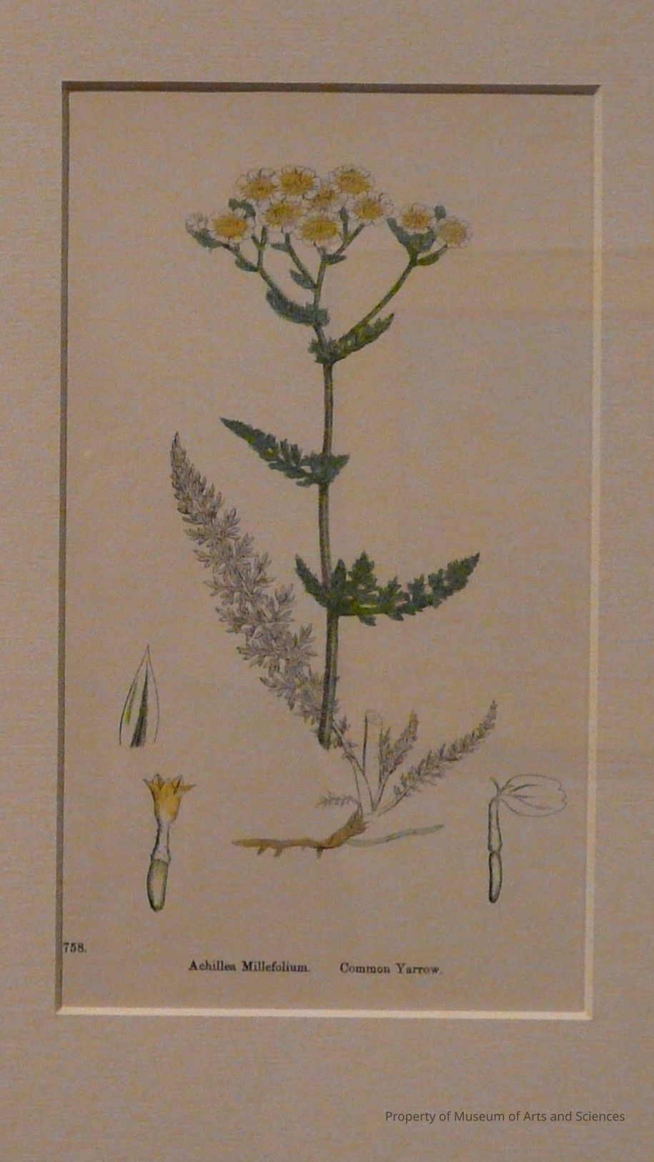 Cenral picture of stem, leaves and yellow and white blossoms. Behind this is a line drawing of leaves and roots. And the bottom right and left are three drawings of flower parts.Artwork Details