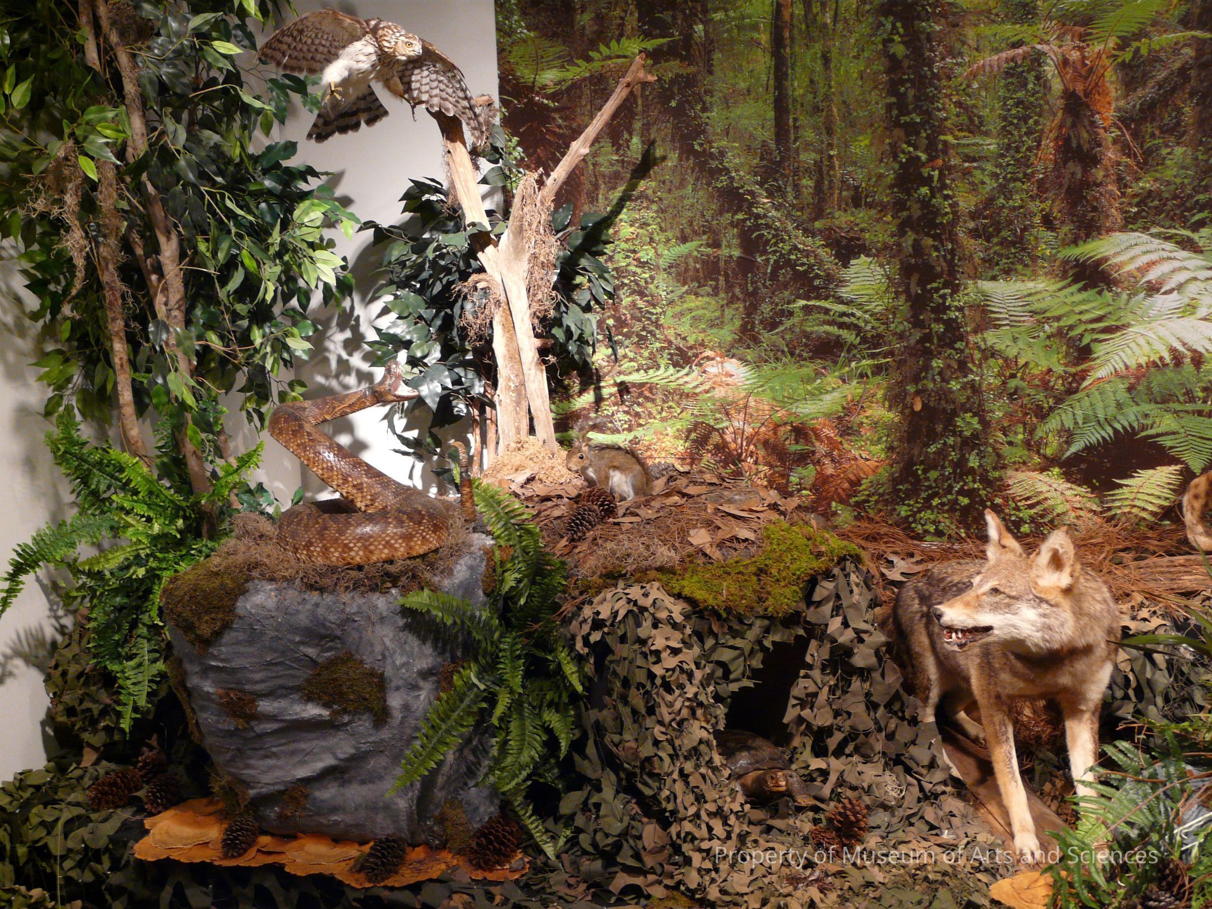 Coopers Hawk flying down to attack a gray squirrel mounted on base with a tree limb.