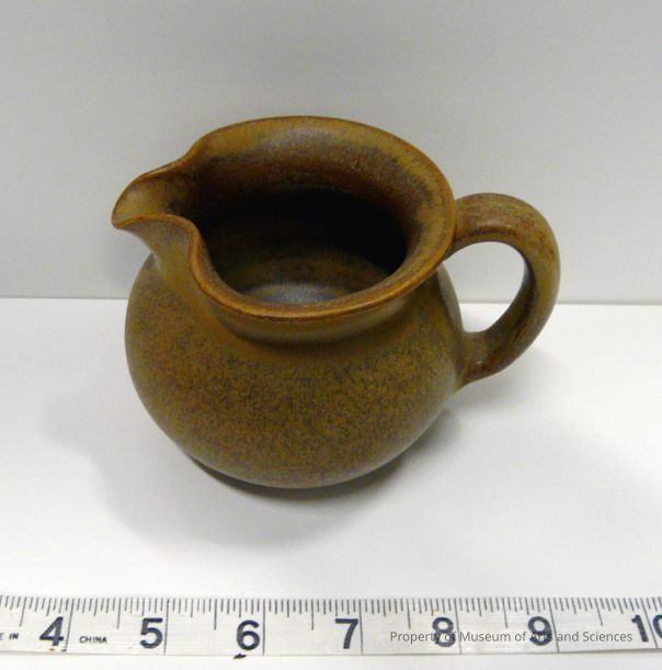 Functional stoneware with Mountain Gold glaze; brown/black color; stamped on bottom. Pieces include sugar bowl with lid and cream pitcher.Collection