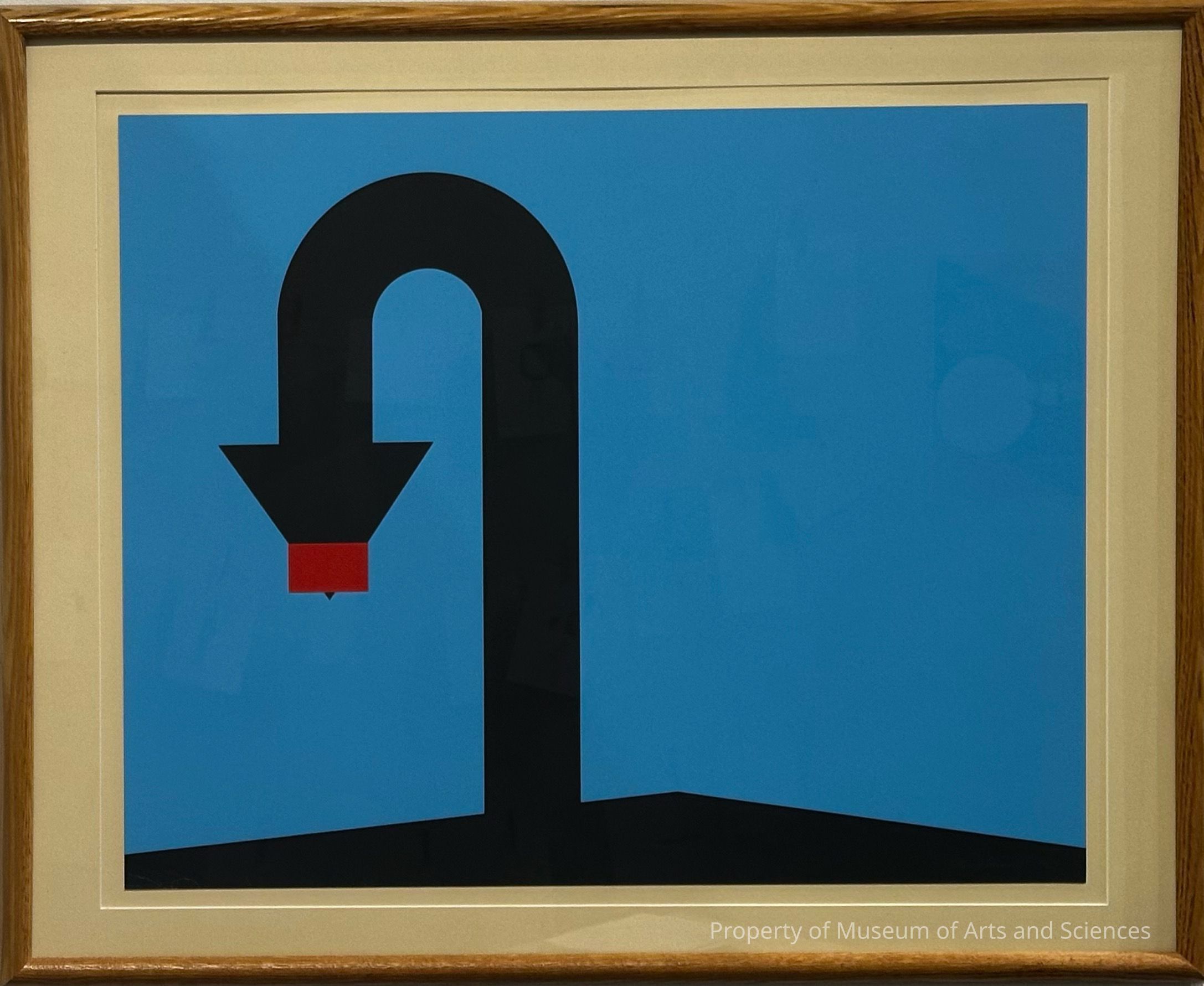 A low isosceles triangle, black across base with arrow shaped figure, tall, bending around and down to left of center. Small red rectangle over point of arrow. Against medium blue background.Artwork Details
