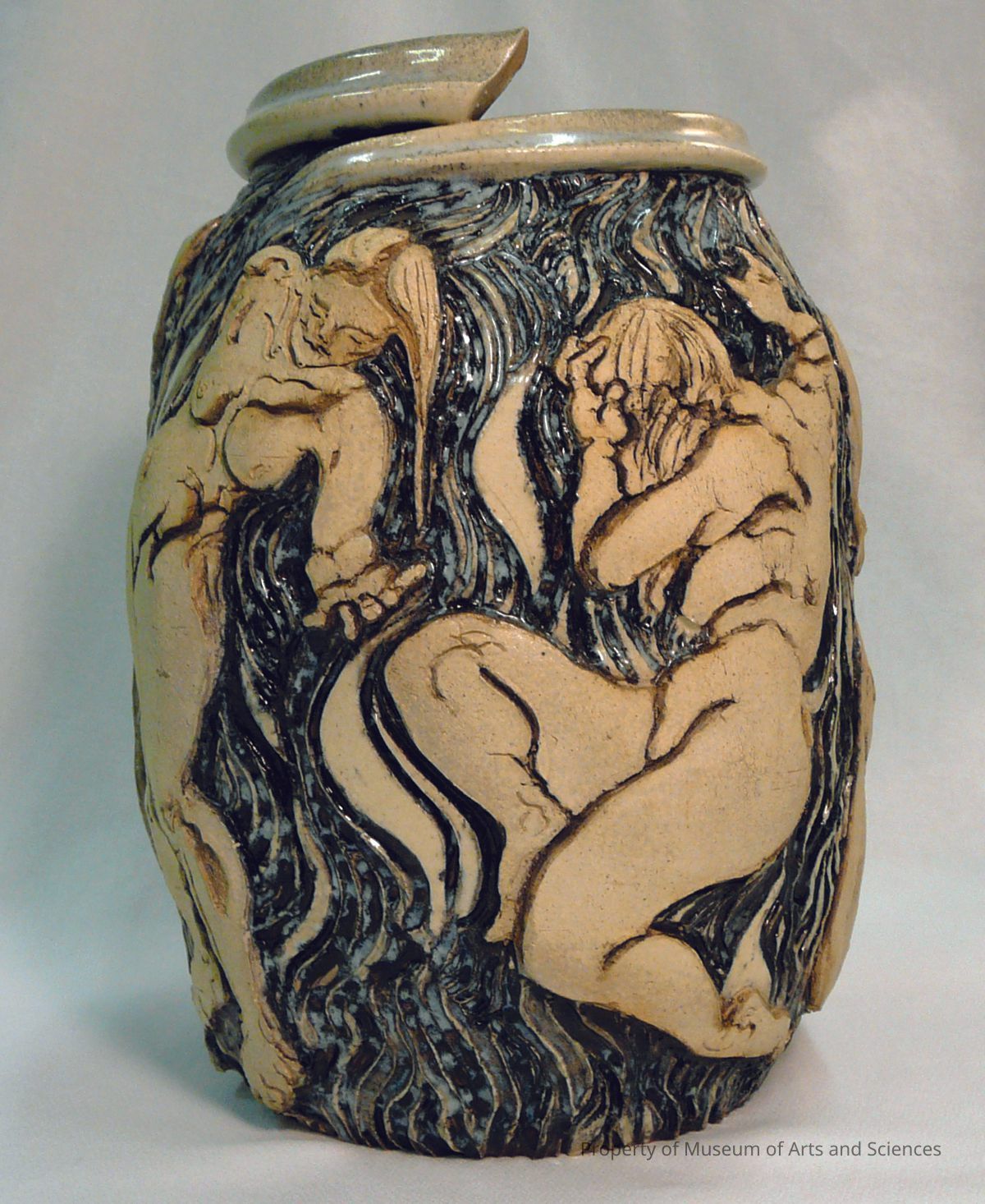 This is a cylindrical jar with a flat base and applied, distorted rim. The surfaces are worked in swirls of black and beige and highlight the distorted bodies of four nude female figures the encircle the vessel and supply dramatic movement to the piece. Lori-Gene is an Atlanta artist best known for her two-dimensional work. This is an example of her creative work in clay. It represents another solid addition to the Museum's ceramic collections.Collection