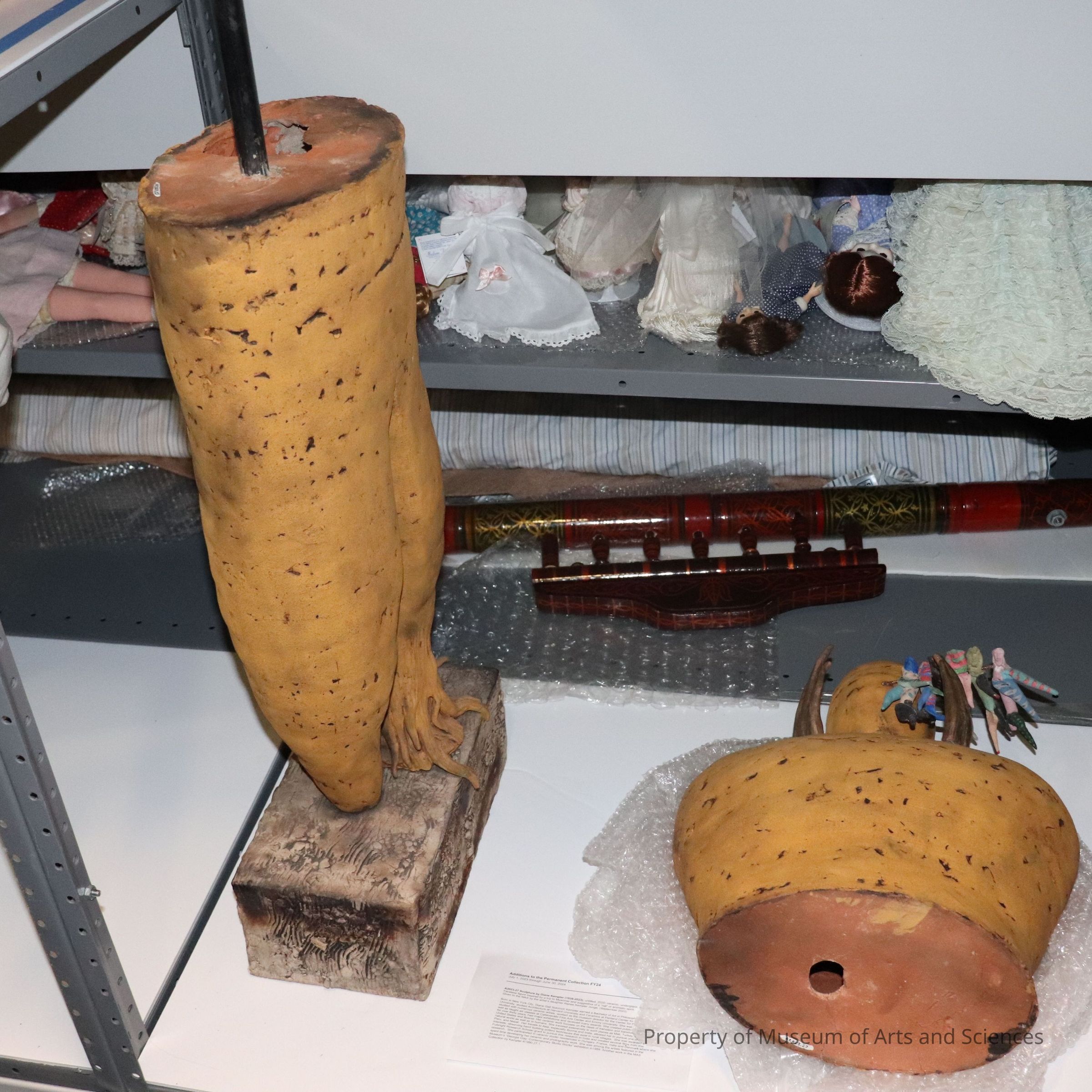 Two-part stacked terracotta faceless human-like figure w/ attachments around the head