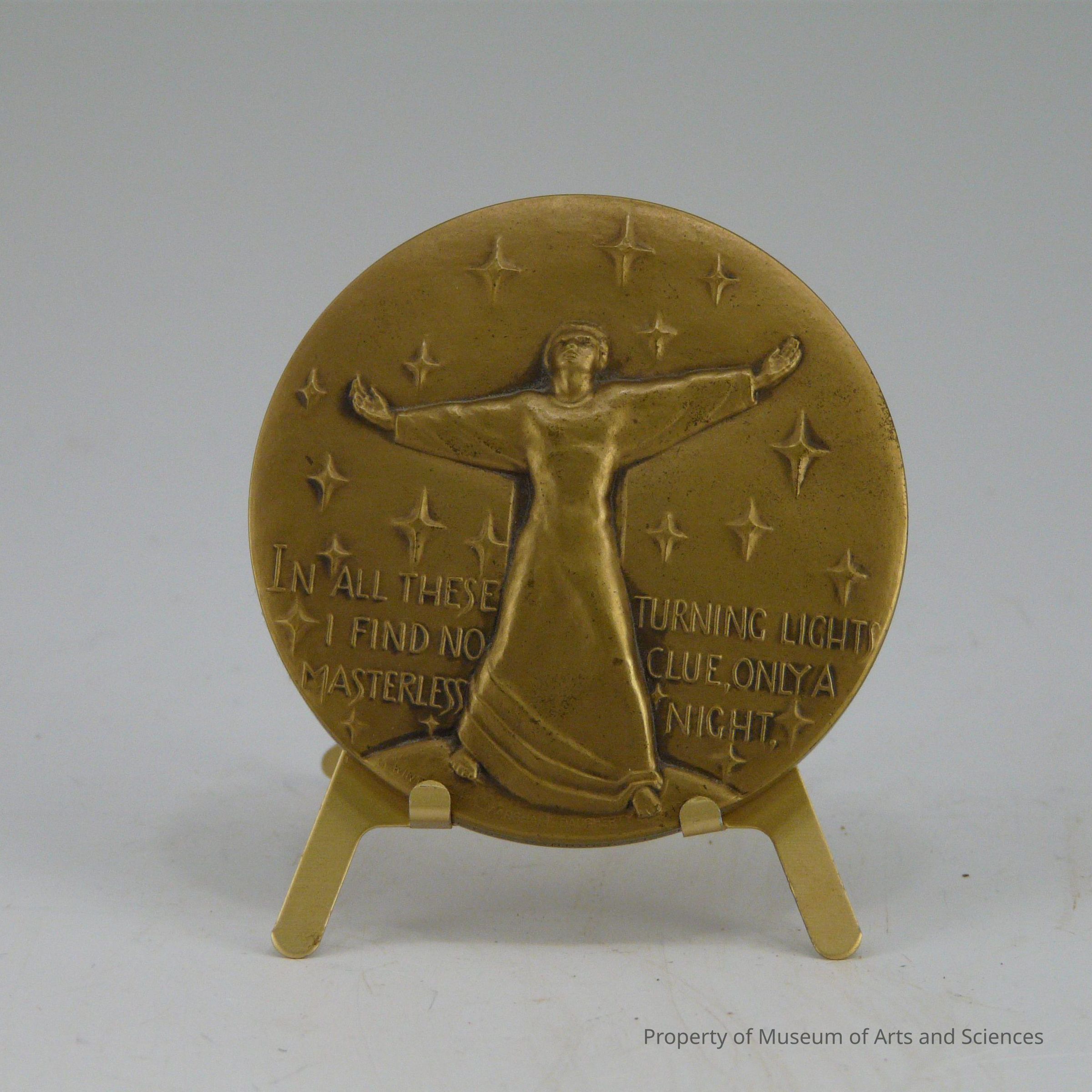 Obverse: standing figure with starts. Inscription: "In all these turning lights I find no clue, only a masterless night." Reverse: crouched figure with inscription "And in My blood no certain answer."Collection