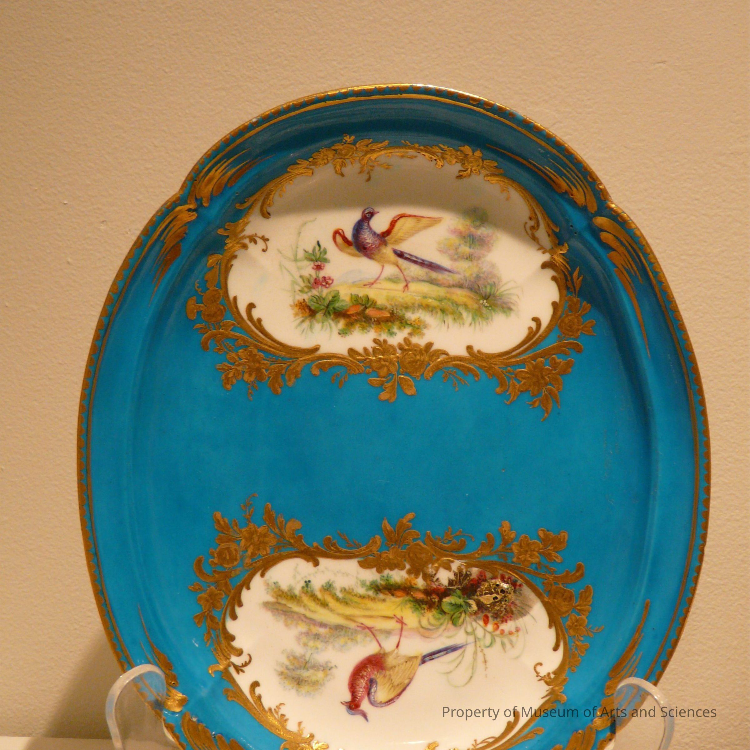 A Sevres porcelain oval plate, turquoise bleu celeste glaze with hand painted exotic birds, gilt medallionsof floral scrolls, glit trim.Collection