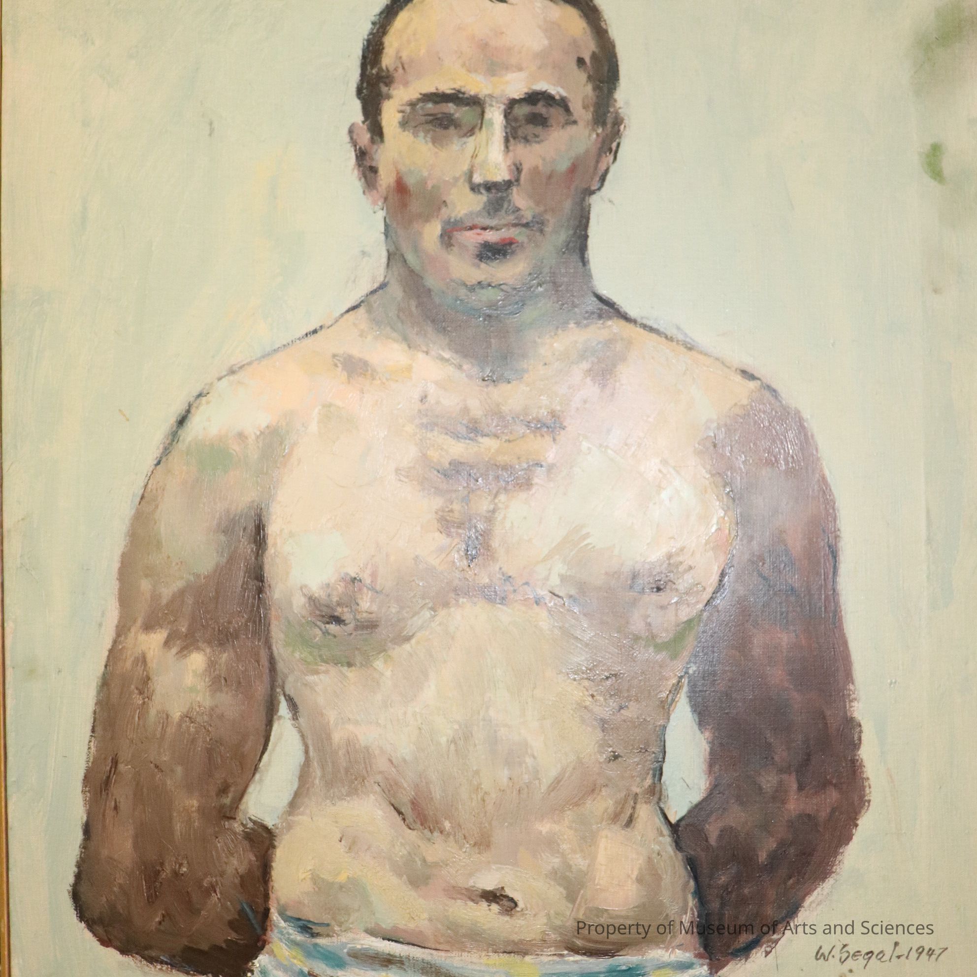 Frontal self portrait of William Segal done from life in studio with arms behind his back and a towel around his waist. Early representation of introspective work painted by Segal over his artistic explorations that spanned his adult life. Color palette reflects those popular in modern decorative arts and interiors of this era and is indicative of subliminal reference to his engagment in the fashion/interior design world of Post War New York through his fabric trade publications.Collection