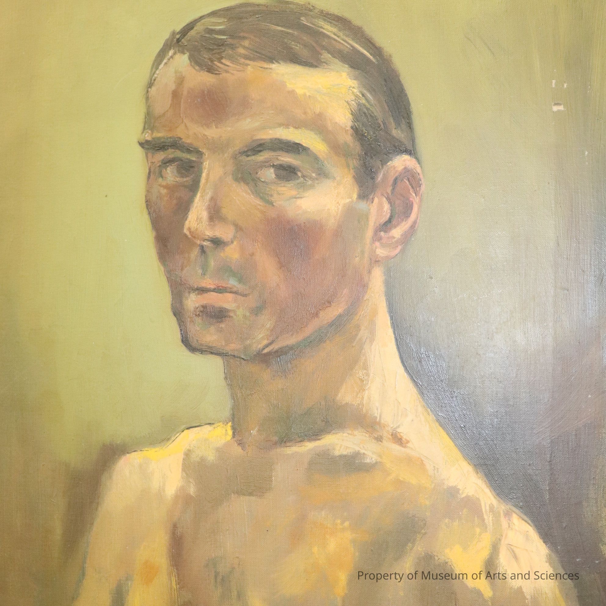 Three quarter view self portrait part of a series of a lifelong exercise of painterly self introspection. This painting is early in the series, shirtless, with face not entirely in full view. shows the unbroken face before his automobile accident in 1970 that caused a reconstruction of the bone and his skull. Color palette and approach indicative of influences of Arts students League in New York where he was studying at that time.Collection