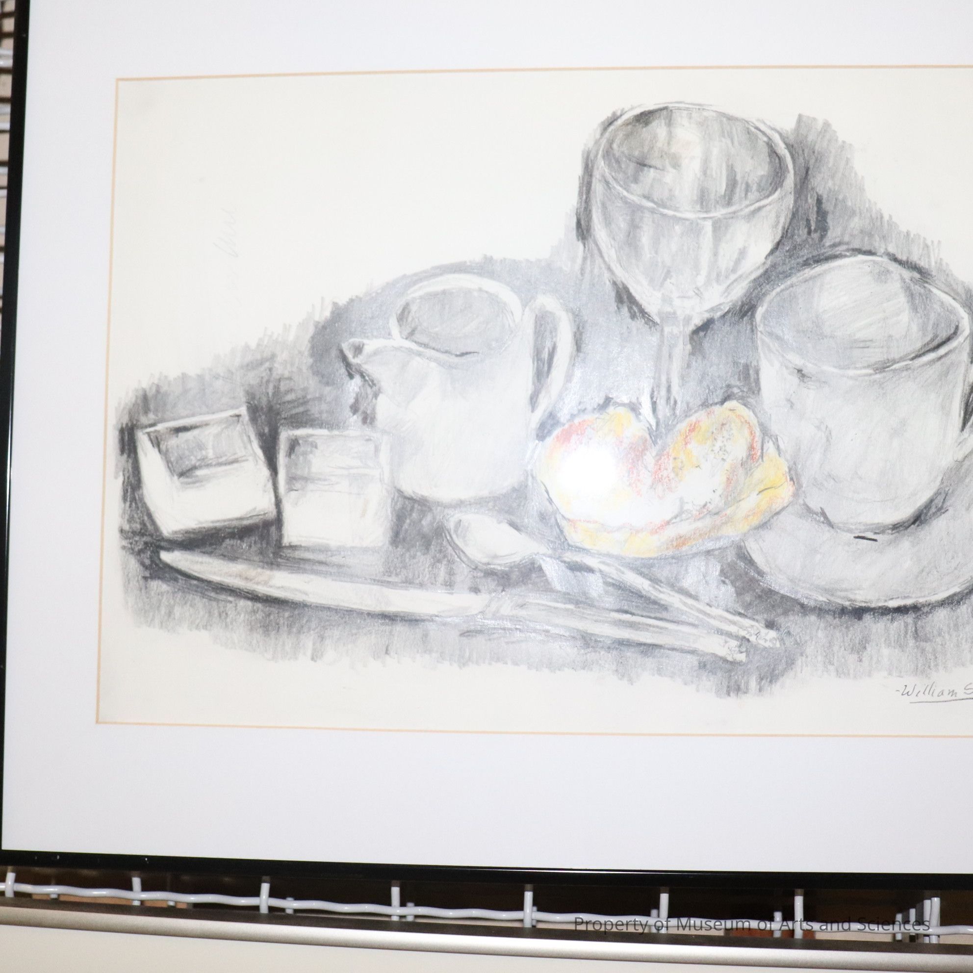 Still life study of breakfast table rendered mostly in graphite with accents of color on central croissant or roll. Segal again is not particularly affected by exact measurement or realism but more of focusing on certain area and aspects of his subject like the perspective og the vessels and the center of composition.Artwork Details