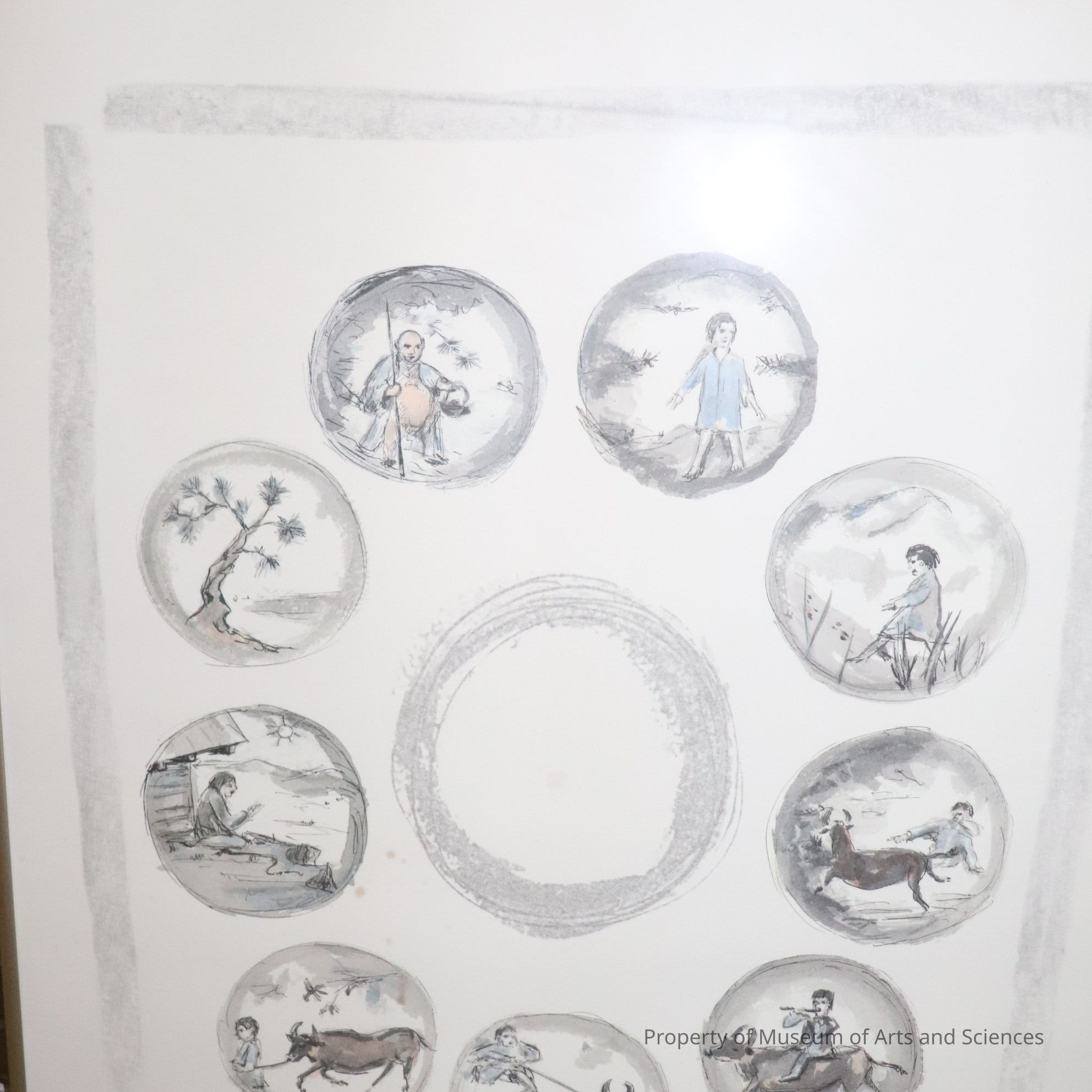 "the Ten Ox Herding Pictures", is an ancient Japanese Buddhist text/poem that describes the awakening process and the process of attaining consciousness. Throuch a series of circular ink and watercolor paintings, Segal relies on the originals painting in Japan during the Kamakura period (1185-1333). The lesson is divided into ten stanzas and illustrated per stanza. One may read translations of the poem and see the orginal works in the metropolitan Musuem of Art in New York where Segal lived. The lessons are widely taught and known as Buddhist parables to raising one's consciousness.Artwork Details