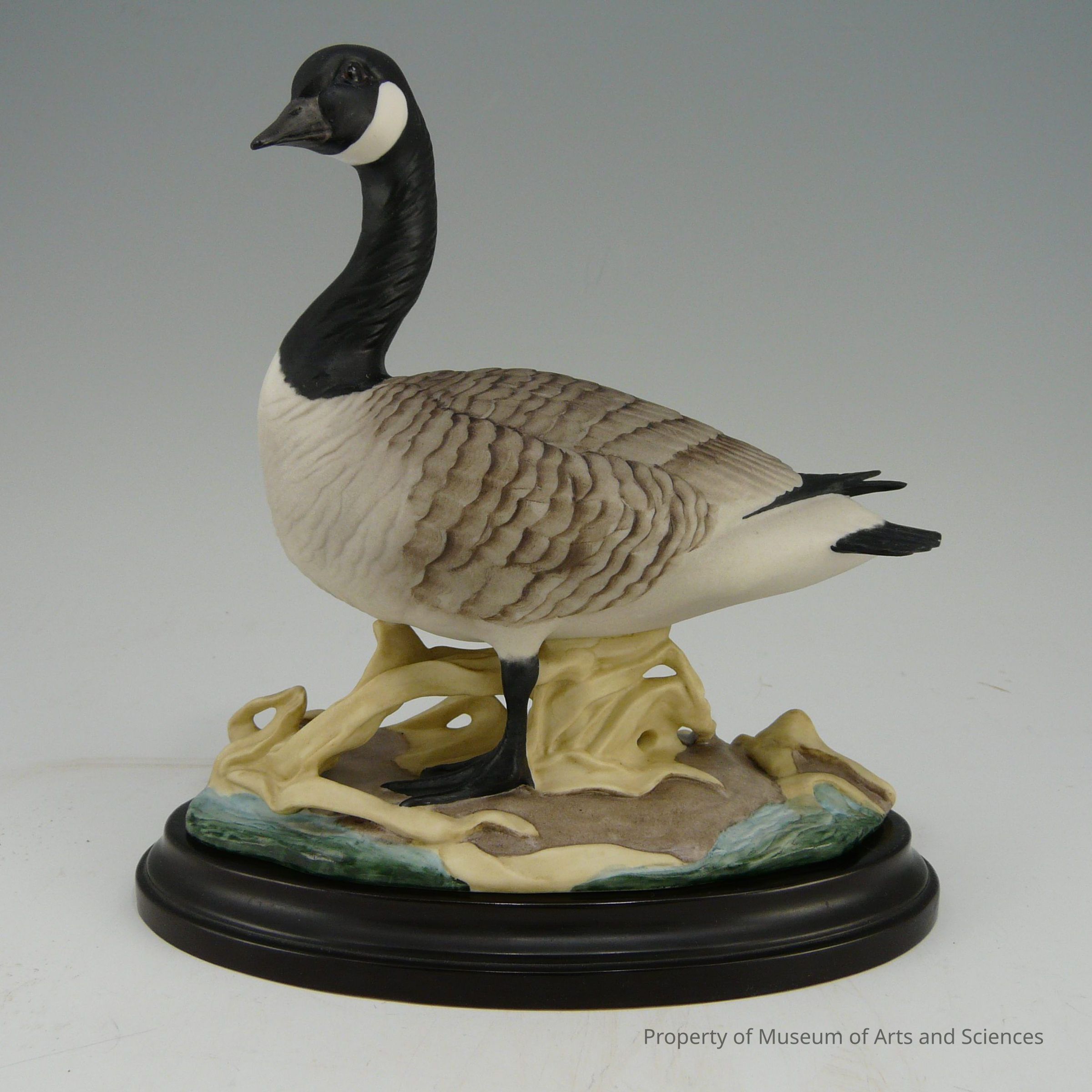 Male is standing with his head erect but turned inquisitively to his proper left side. Goose stands on a beige, brown and green oval base with a separate oval base designed to imitate lacquered wood. The work is stamped on the base and reads: Boehm/Canada