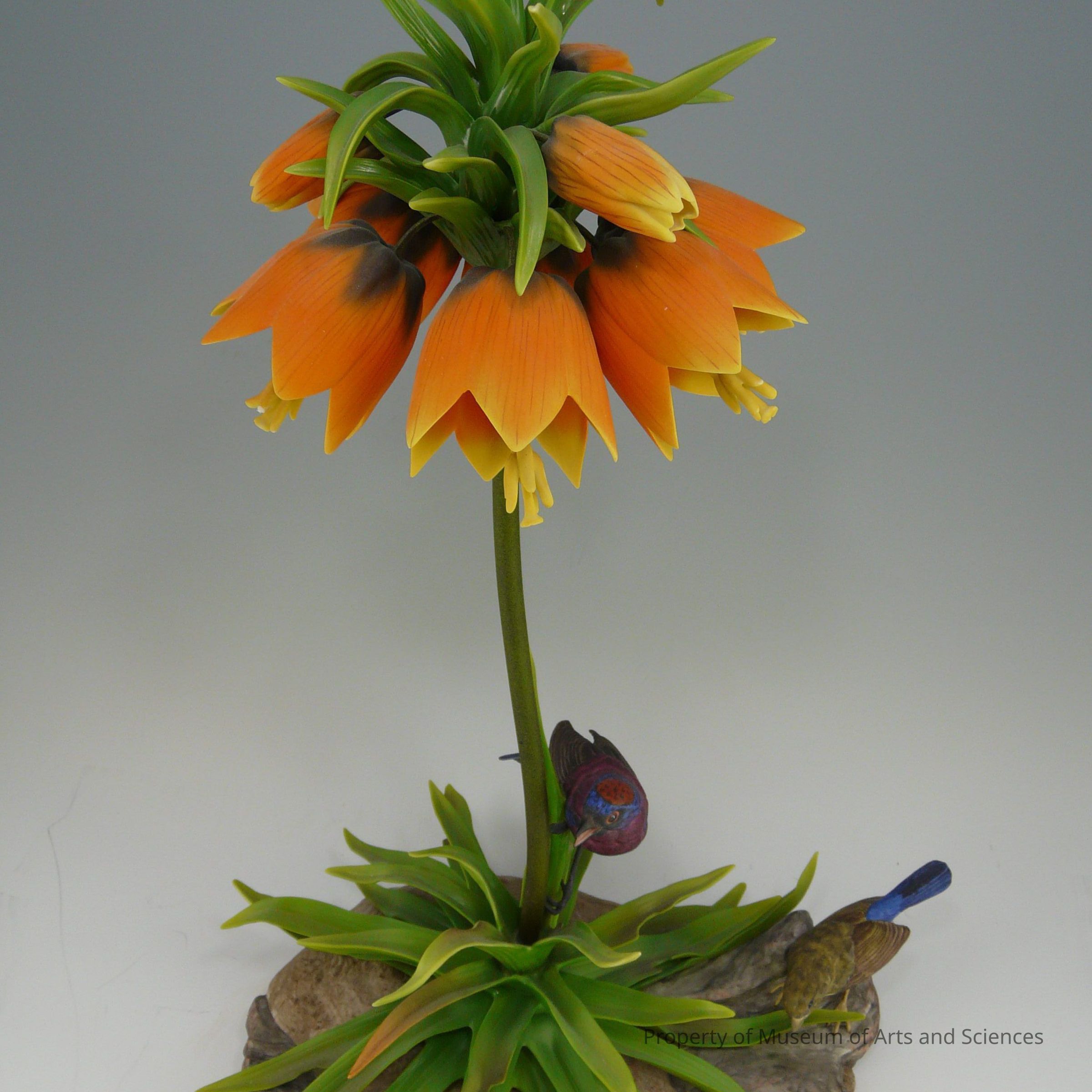 Two buntings are nestled on leaves at the base of an imperial lily with bright orange and yellow blossoms at the top of a green stalk. The work is stamped in a shield on the base: Boehm Limited Edition #481 Made in USA. The work is signed on the base: B-Collection