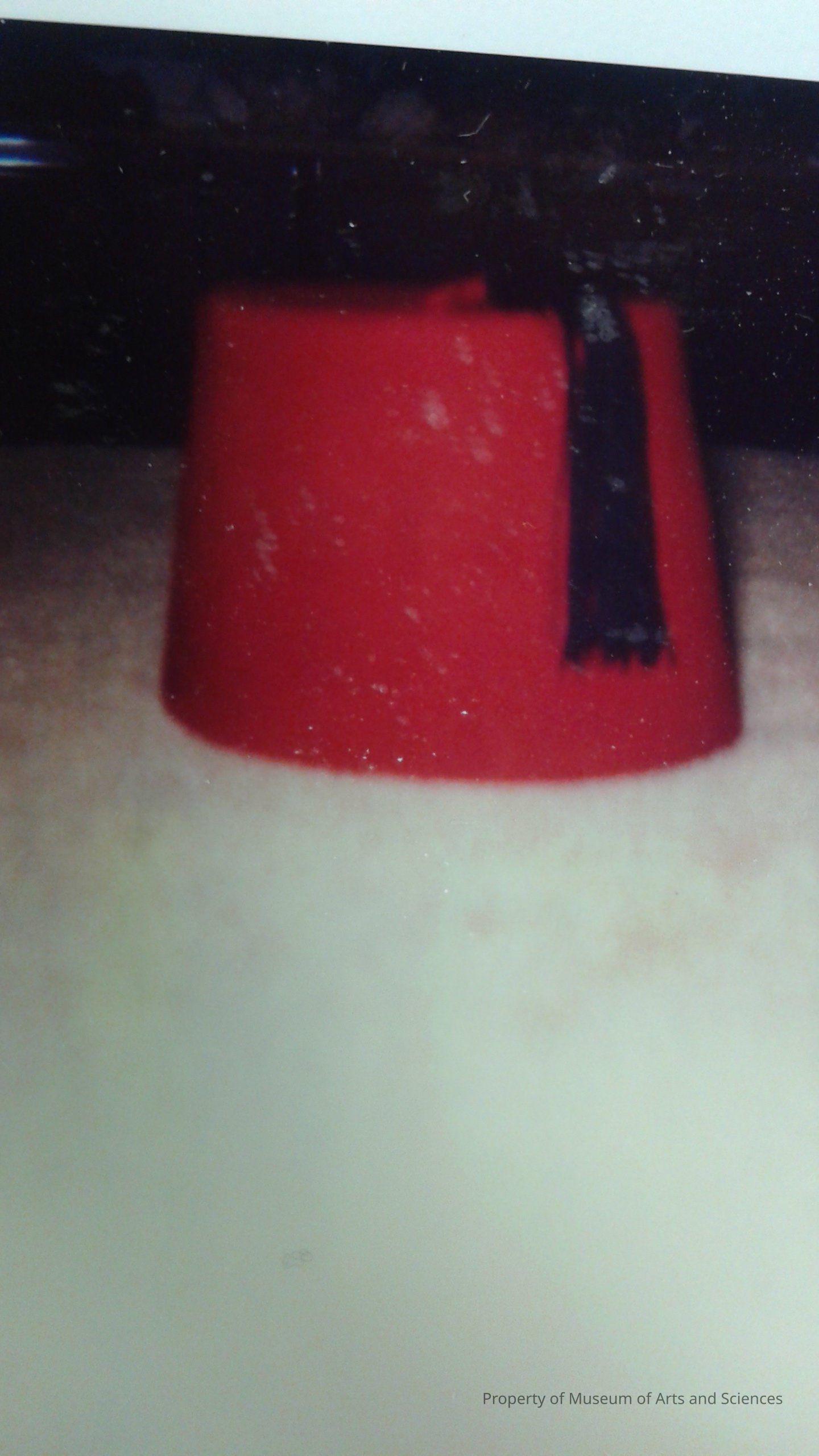 Red fabric covers a straw hat. The hat is cylindrical in shape, however the circumference of the bottom of the hat is larger than that of the top. A black tassel hangs from the top of the hat.Artwork Details