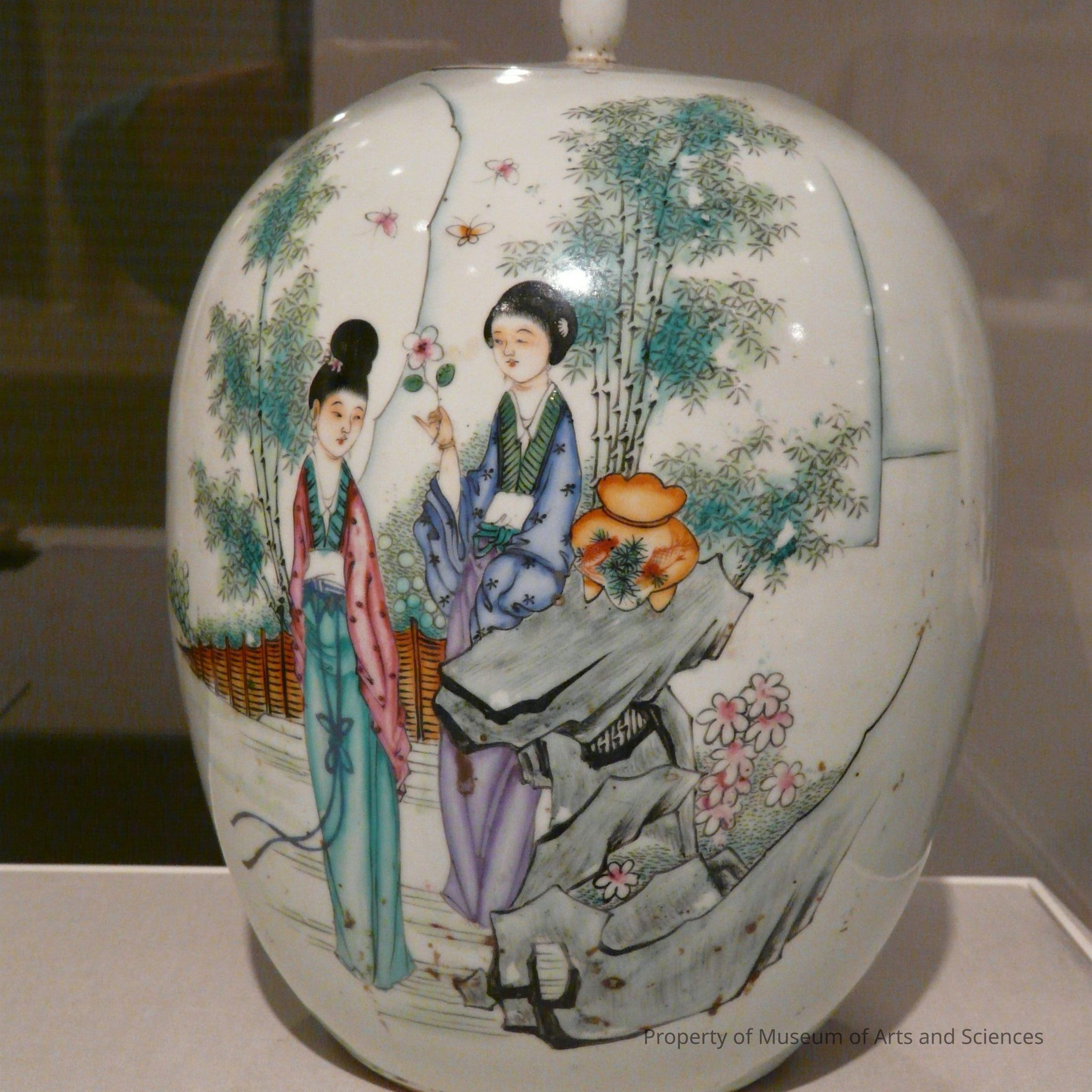 One of a pair of Chinese melon shaped porcelian jars with a lid surmounted by an acorn finial. The body is decorated withtwo women in a garden and a stone seat on the obverse while the reverse has several vertical lines of inscriptions. Body is a; lid iCollection