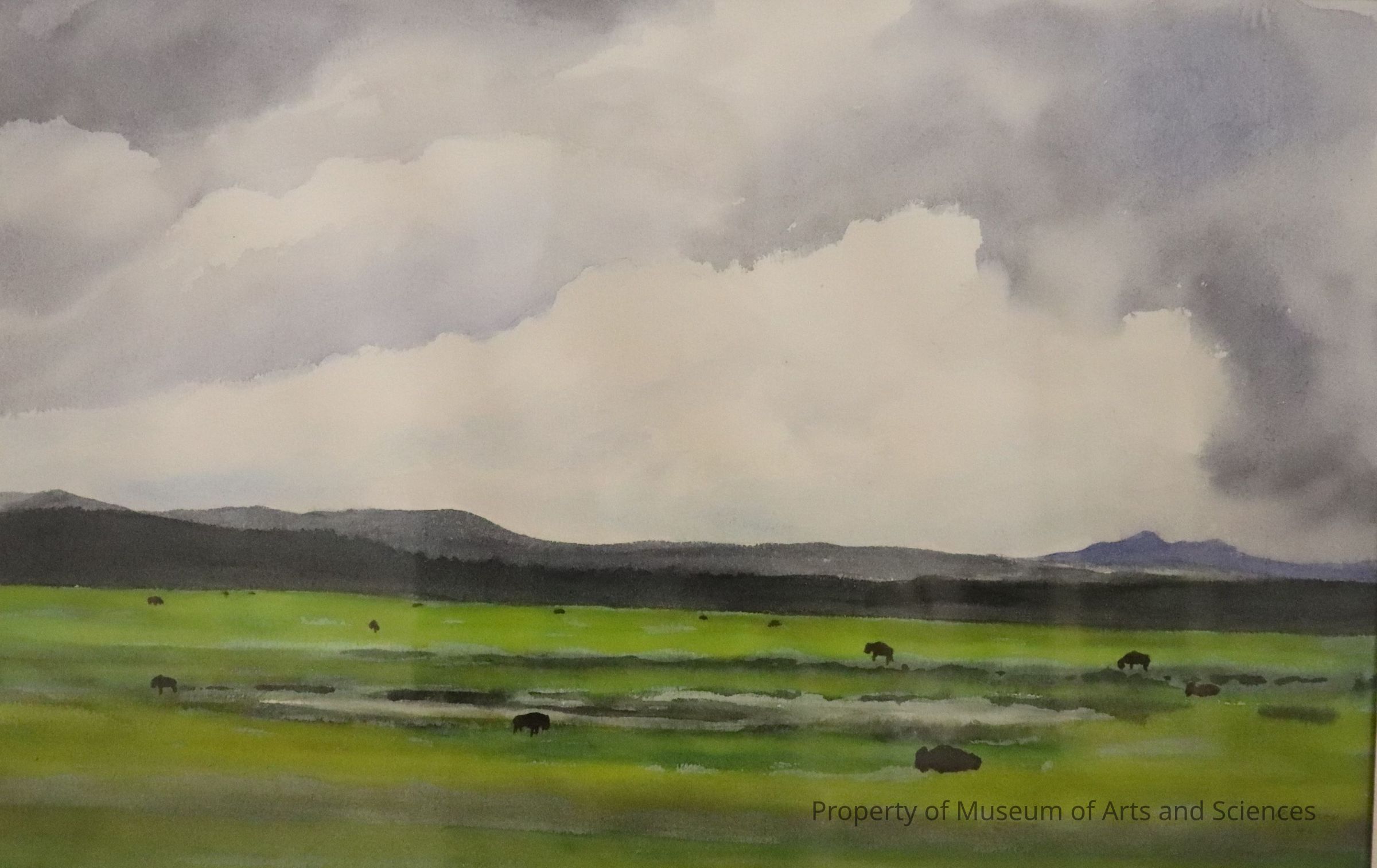Western landscape. Field with buffalo in foreground. Distant mountains.Artwork Details