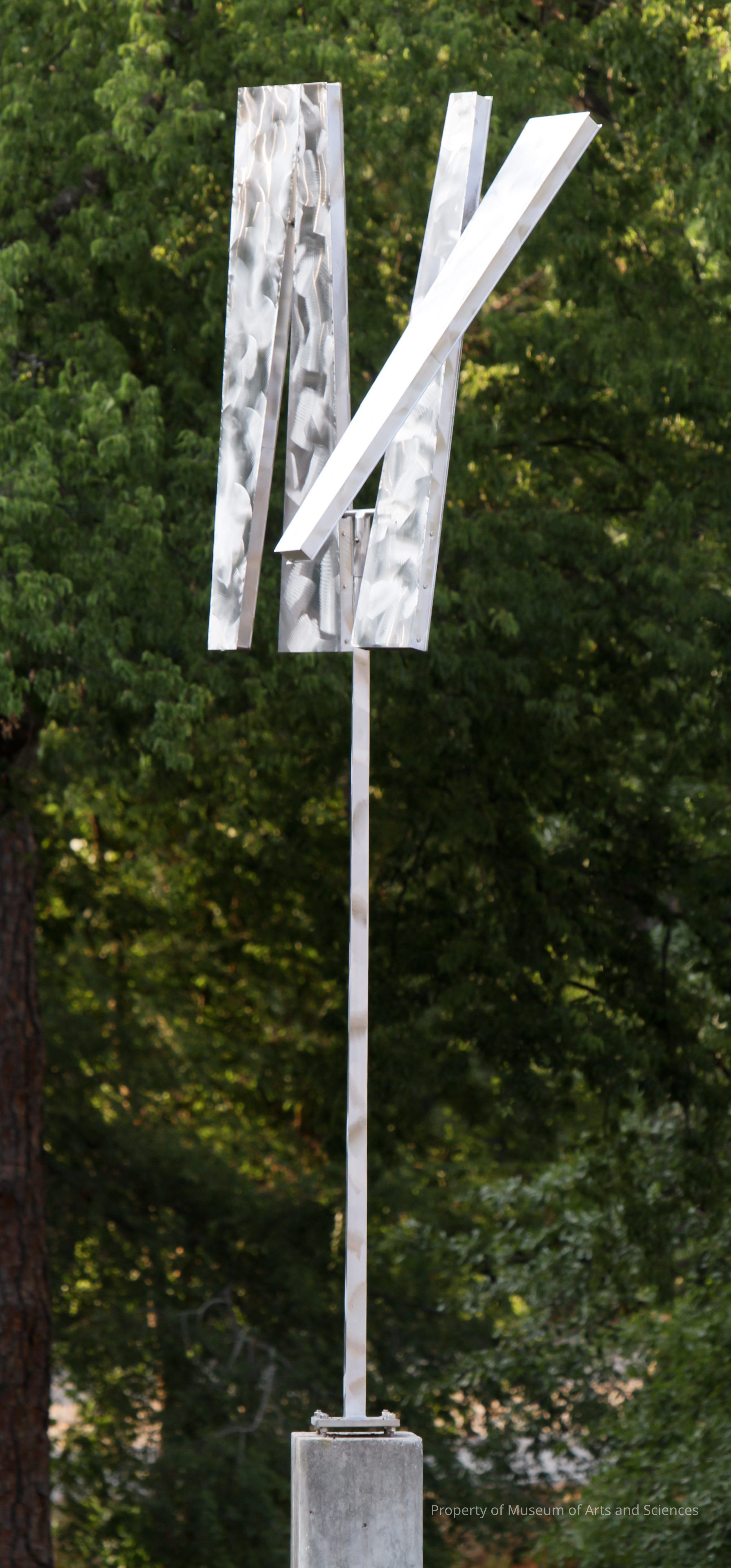 This is a stainless steel kinetic sculpture by George Rickey. It has a square base with four corner drill holes that secure it to the concrete platform with screws. From the base there is a square post that rises from the base and tapers towards the topCollection