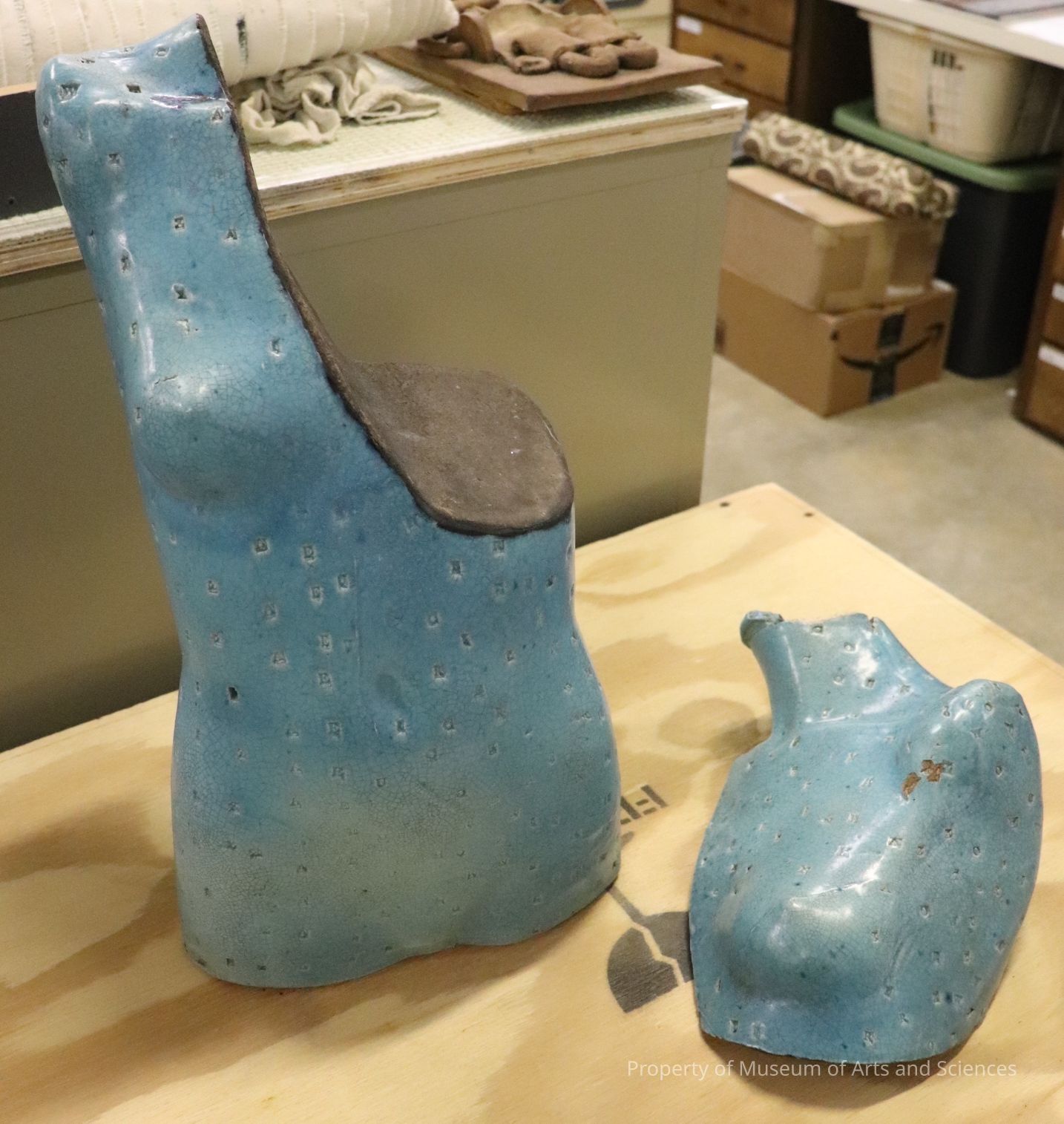 Female torso in 2 parts (right breast and shoulder disconnected). Blue-gray w/ letters embossed randomly across surface.Artwork Details