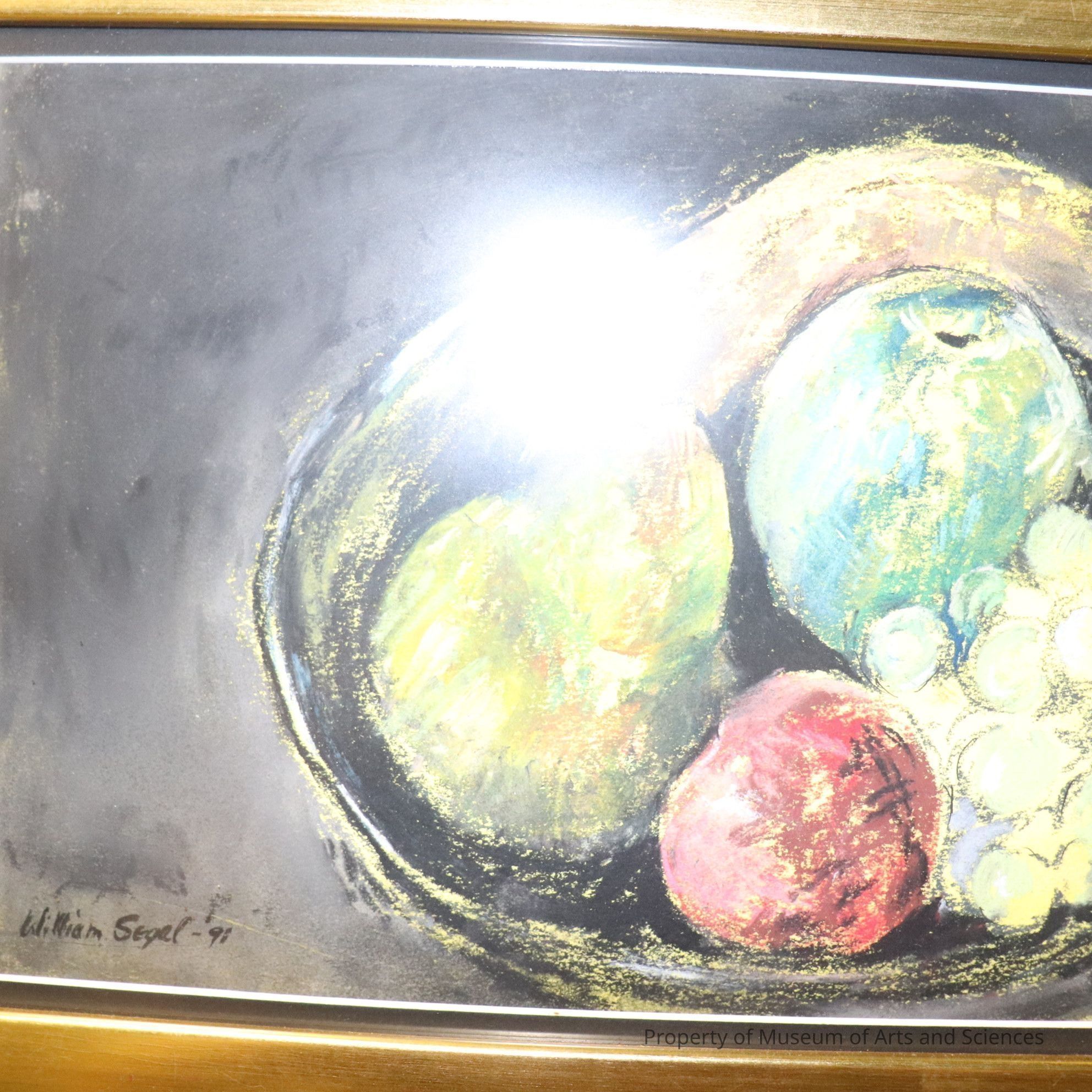 Choosing carefully to offset the still life on the surface or table so thate there is interest in this composition was intentional by the artist. In order to keep visual complexity and focus on the fruits, Segal used negative space on the left of the canvas to act as a foil to his subjects. When an artist repeats a subject/series, it is important to make some changes in presentation so that the whole does not become static, repetitive, or boring. Segal's use of paint and color to show texture is evident. This still life is more fully developed than many of his previous pieces.