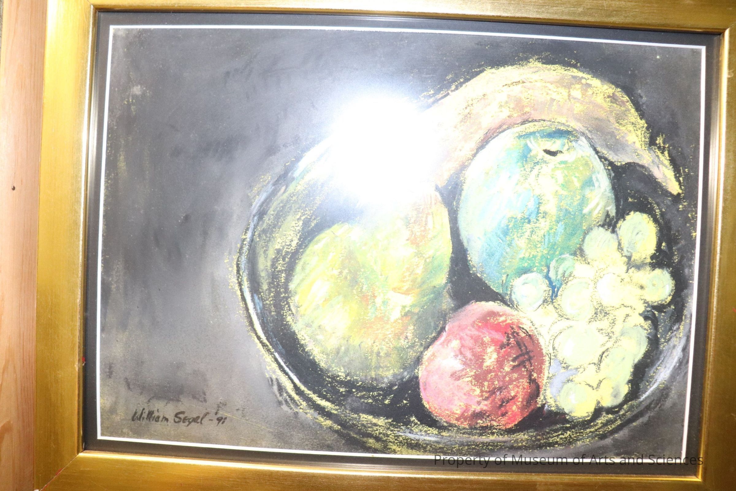 Choosing carefully to offset the still life on the surface or table so thate there is interest in this composition was intentional by the artist. In order to keep visual complexity and focus on the fruits, Segal used negative space on the left of the canvas to act as a foil to his subjects. When an artist repeats a subject/series, it is important to make some changes in presentation so that the whole does not become static, repetitive, or boring. Segal's use of paint and color to show texture is evident. This still life is more fully developed than many of his previous pieces.Collection