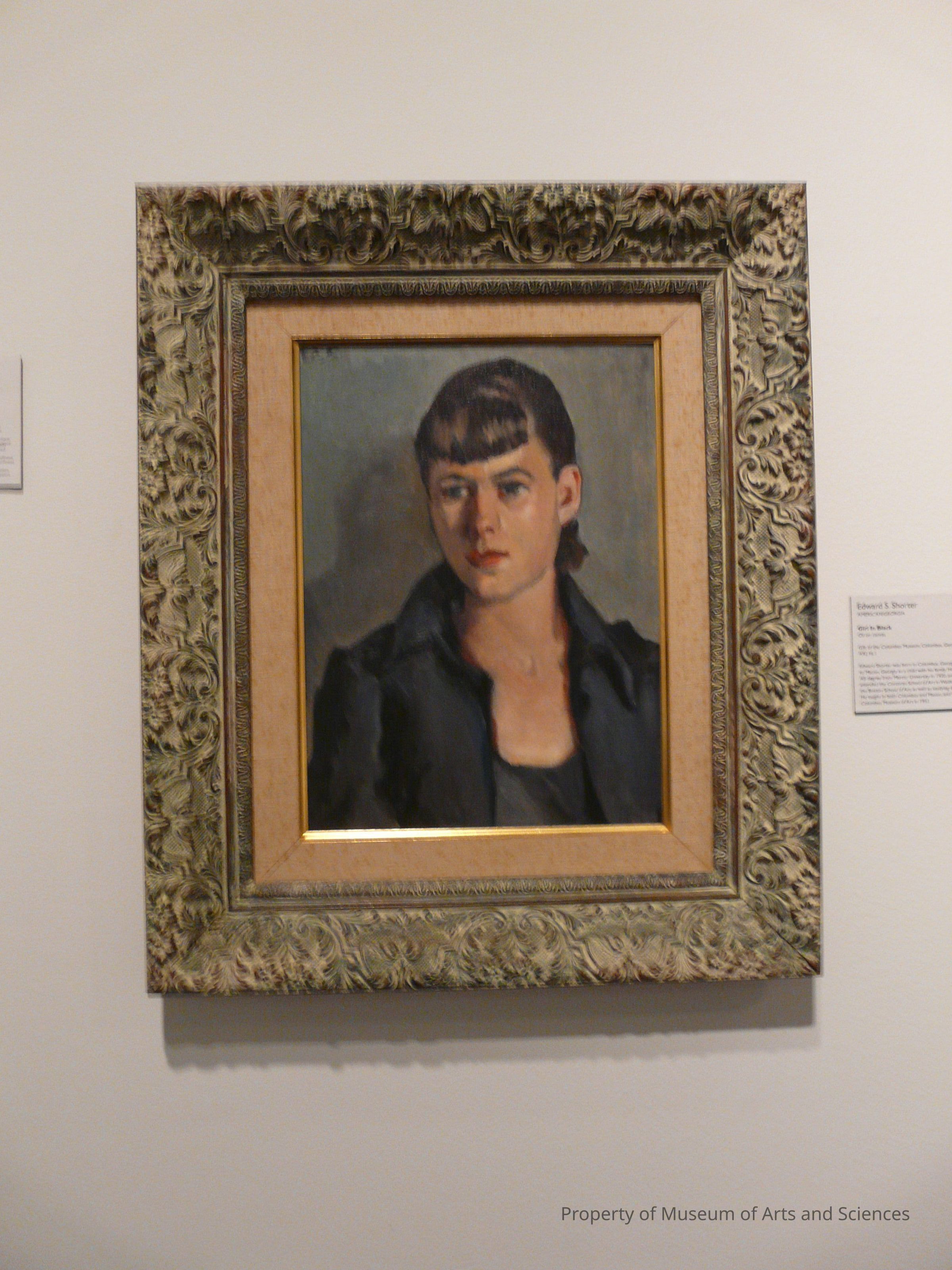 Figure study of a young woman wearing a black dress and jacket. She looks slightly to the left; her hair is dark with banks and the sides tucked behind her ears. The jacked is coloraed and open at the front revealing a scooped neckline on the dress.Collection