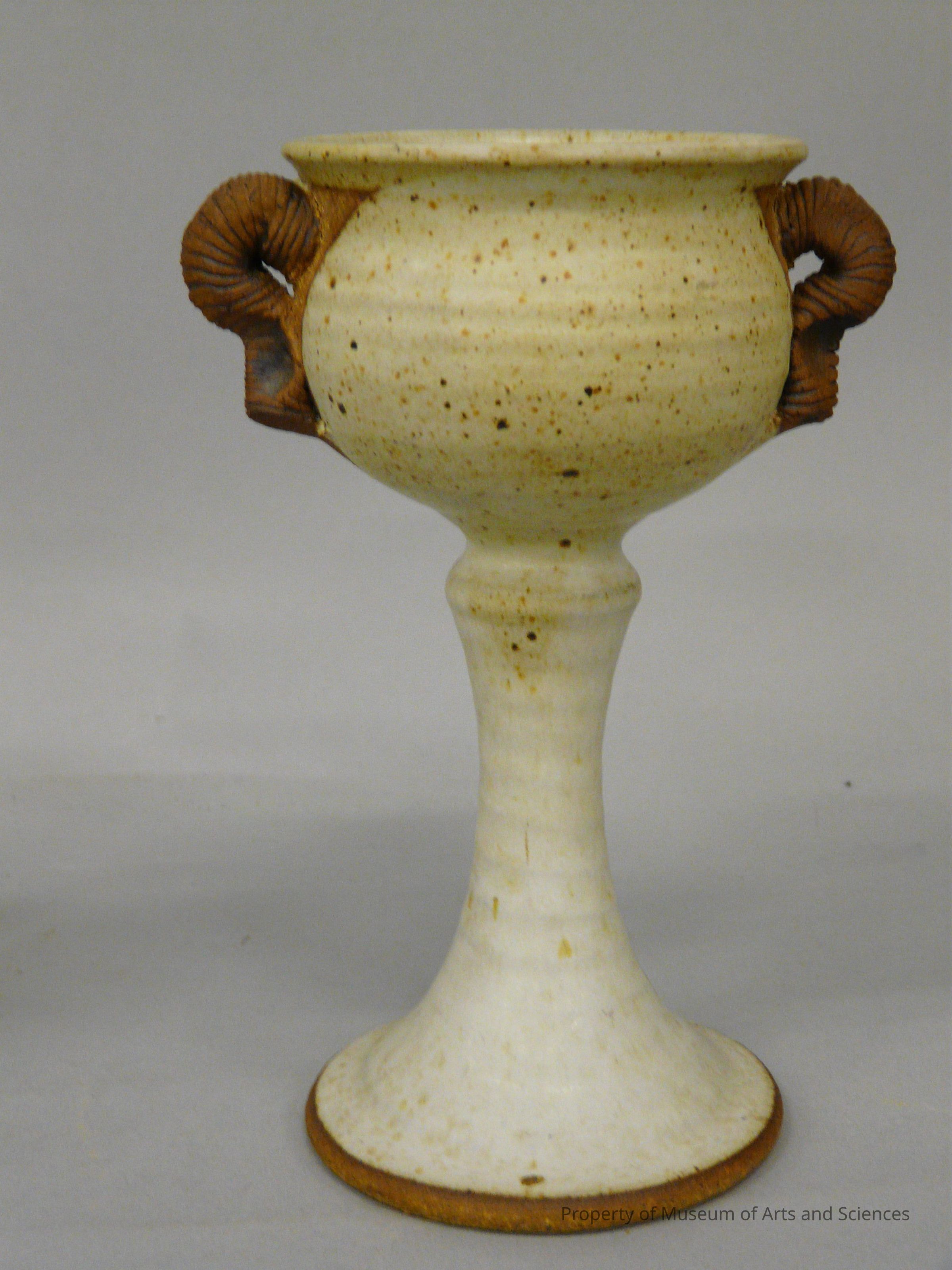simple design goblet glazed light tan with darker brown handles on either side made of striated "fingers" of clay which resembled fat caterpillarsCollection