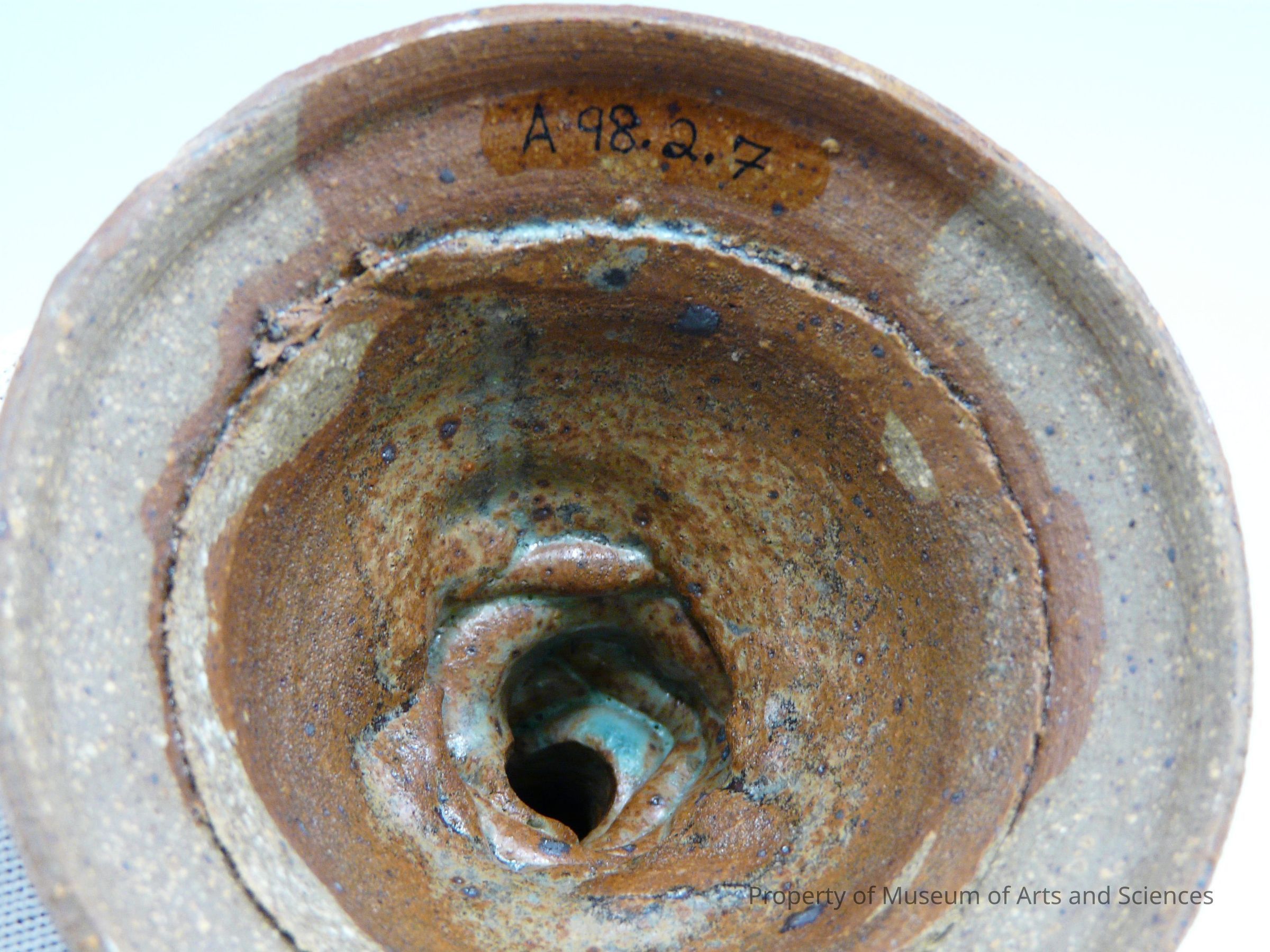 Stoneware goblet with partially glazed exterior and gray glazed interior , 9"HX4"dia