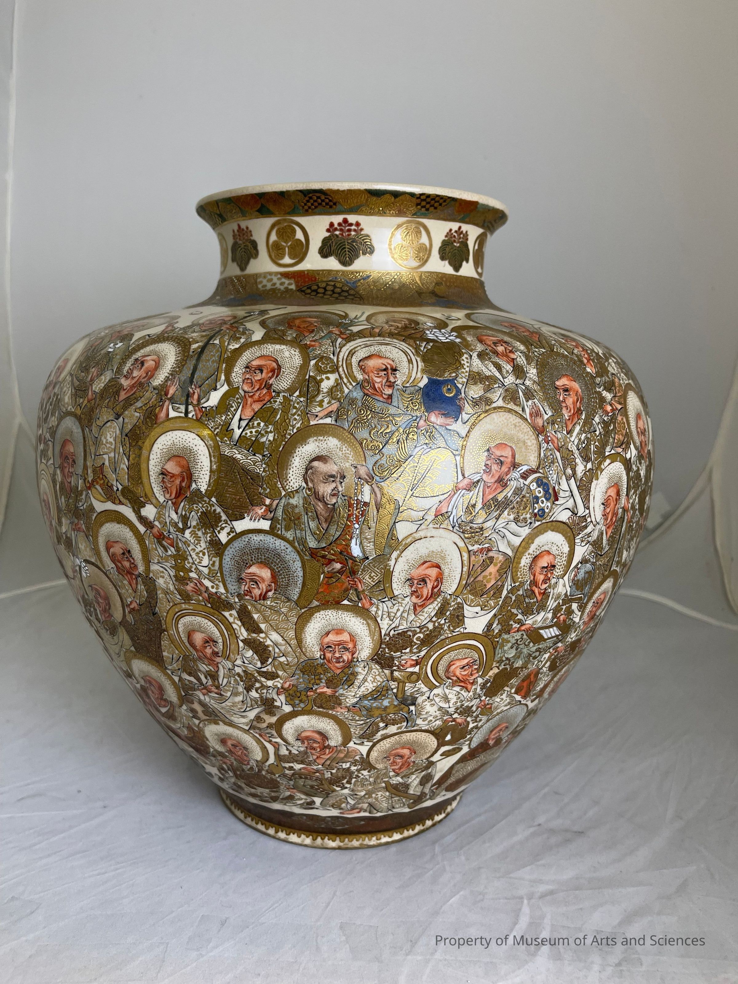 Custom Satsuma marriage vessel with mins (family crest) of Toyotomi and Tokugawa on cream field around the cove neck, swell shoulders tapering to round foot with gilt black banding, the field hosting seated contemplating Lohans-Sennin-Rishi (Immortals) and Kwannon each with gilded haloes. Meiji periodCollection