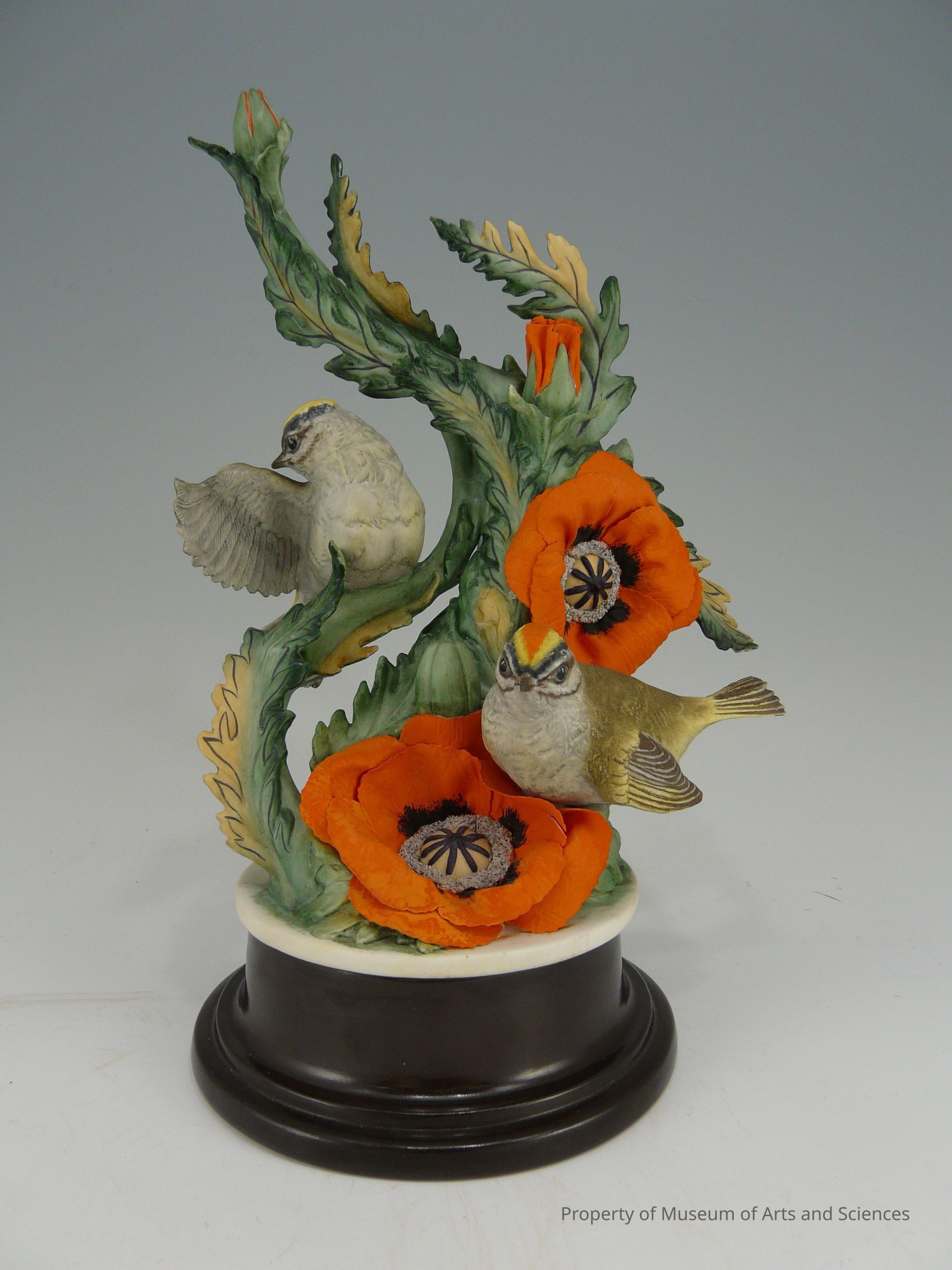 A pair of kinglets perch on an orange flowered plant with two open flowers, two opening buds, and one closed bud. The female is on an upper leaf on the left side with its proper right wing extended and its head turned towards it.Collection