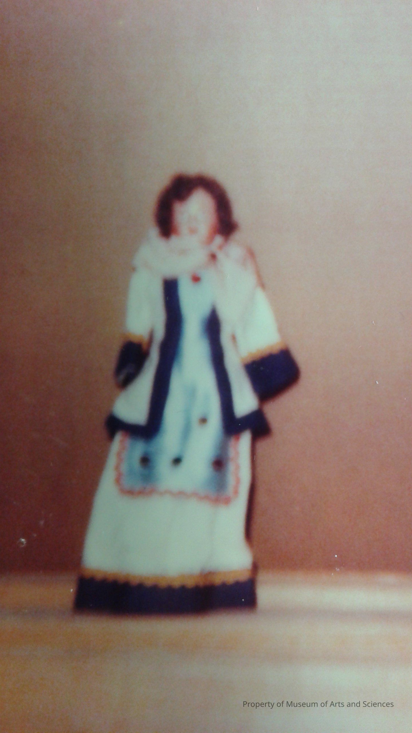 This figure wears an off shirt trimmed at the bottom with a thick band of blue. The top of which is a row of glod nick- nack? She wears a light blue blouse with one red (?) in the center. She wears an apron of the same light blue material trimmed on the edge with coral (?) and decorated on the front with 2 red, 2 gold, and 1 green sequin. The jacket is a off white trimmed in blue on the edges.Collection