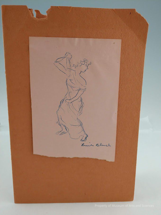 Pen drawing of female greek figure, perhaps dancing while looking to their left.Collection