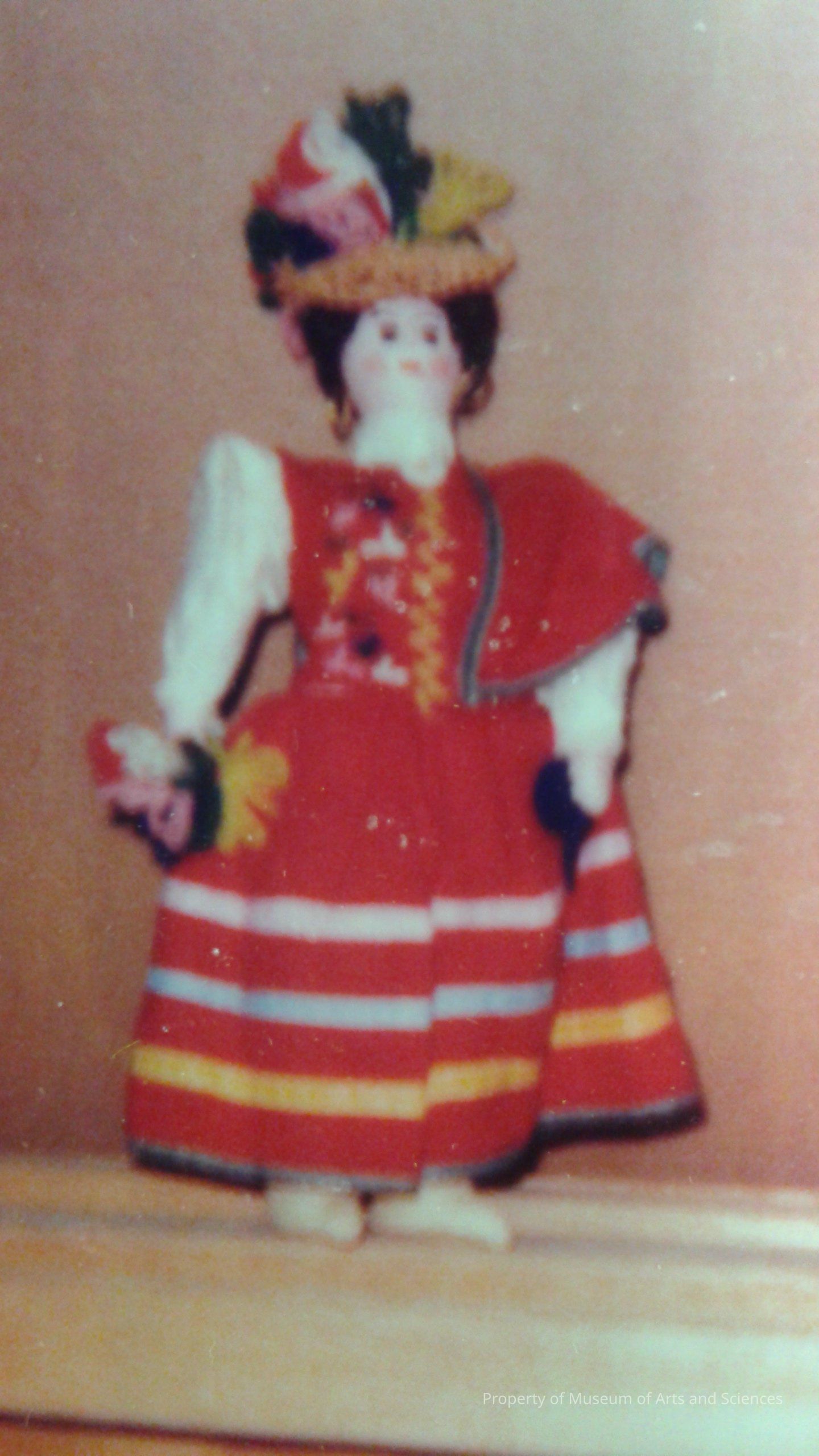 She wears a full length skirt made of red felt like material trimmed at the bottom. Her cream colored high necked blouse is topped with a vest? of the same red material decorated with embrodered yarn. floewrs of pink, blue, yellow, green, and white. A shawl made of red felt and trimmed in the same green material at the hem of the skirt is draped over her left shoulder.Collection