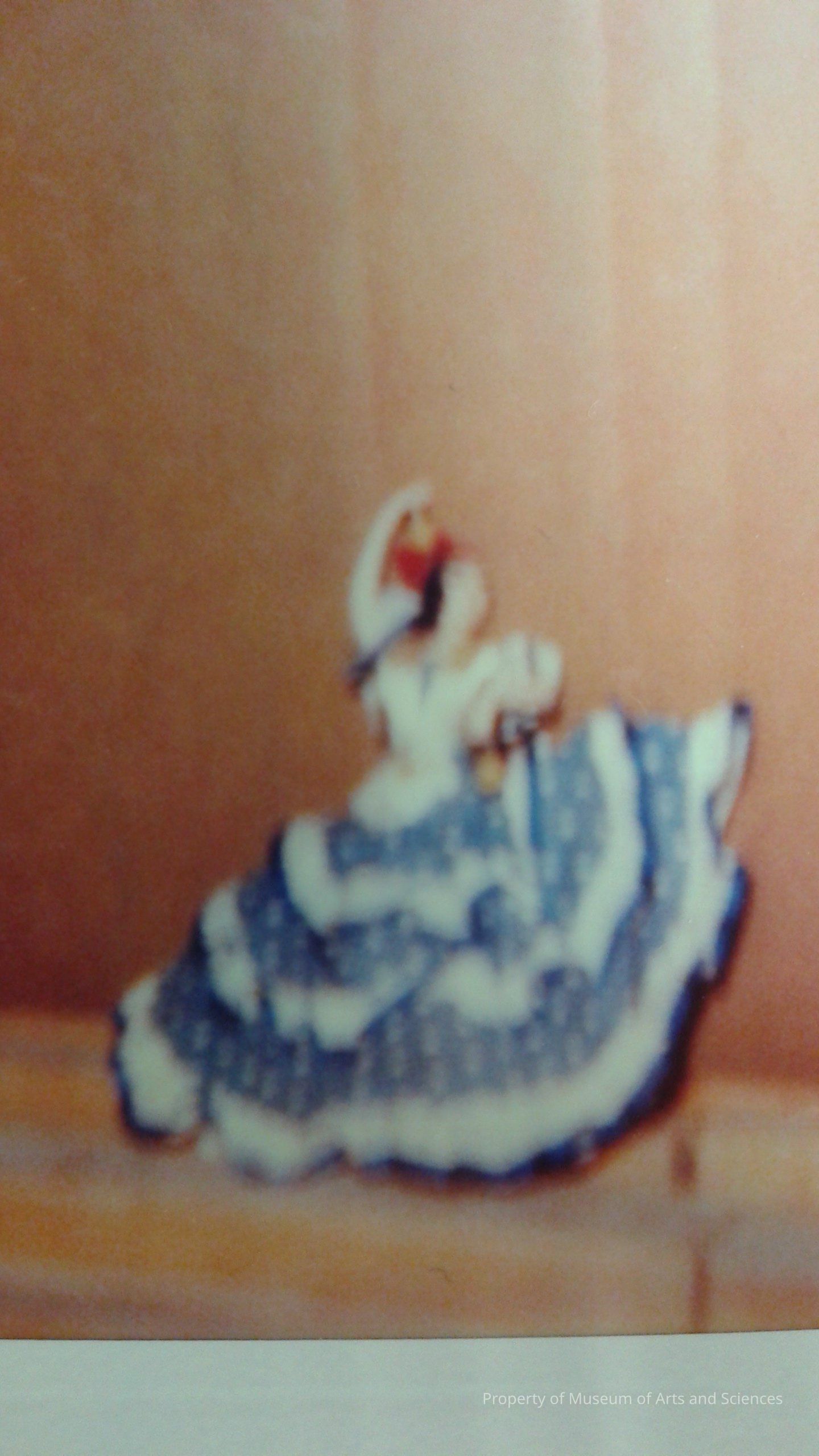 She has short white ruffled sleeves. And her shawl is a white patterned fabric. the castanettes are made of tiny yellow and red balls. Her body is posied as if she were dancing.Artwork Details