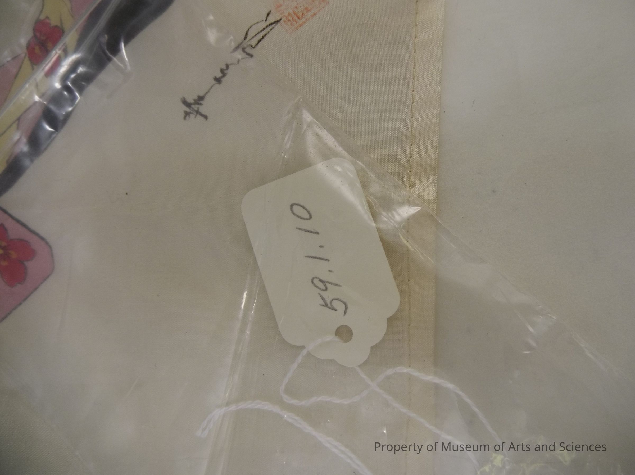 White silk, painting in center of Japanese woman wearing kimono of purple and yellow stripes with red flowers holding a small horses head in right hand Japanese characters on right and leftArtwork Details
