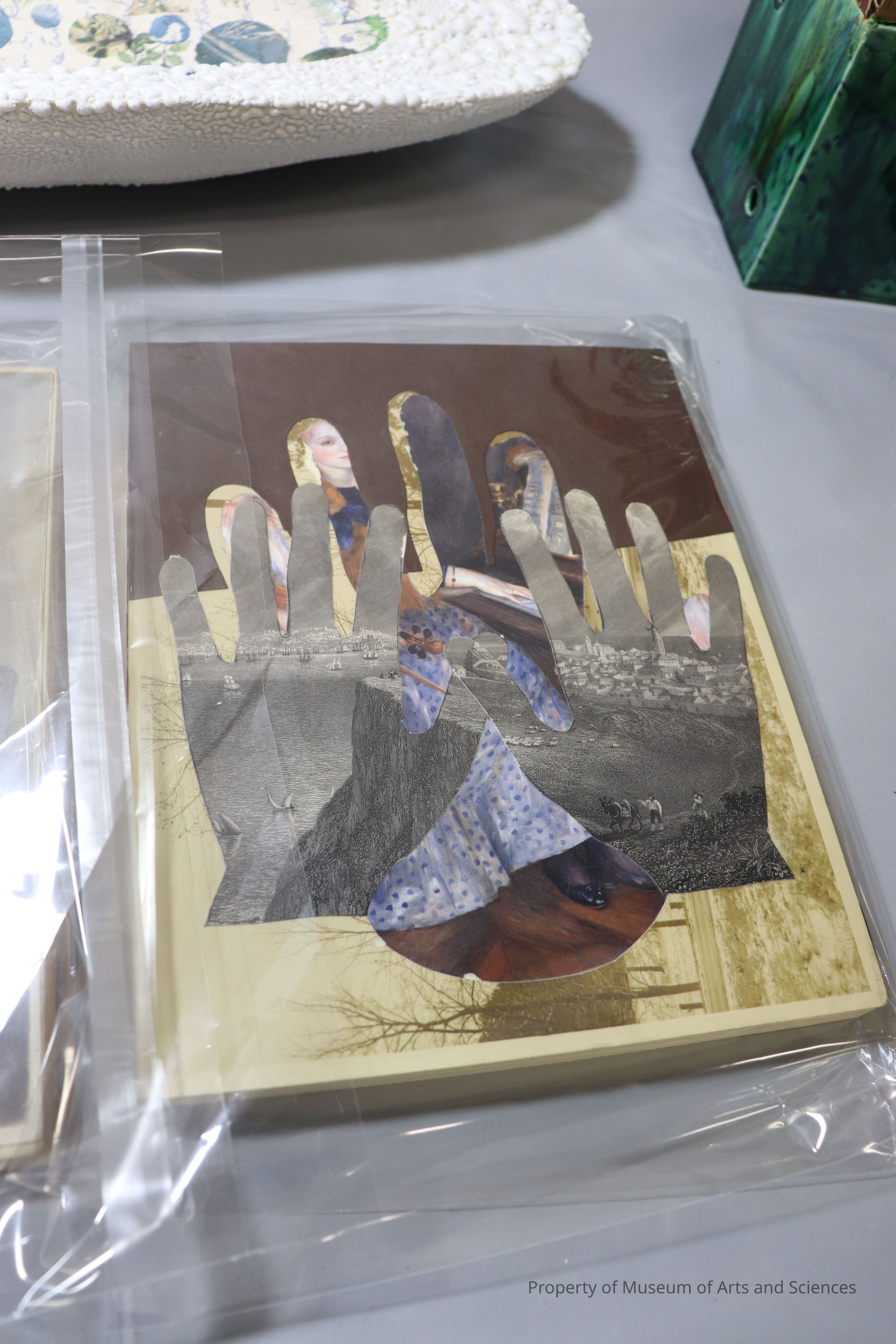 1 of a series of 3 collaged wood panels w/ hands
