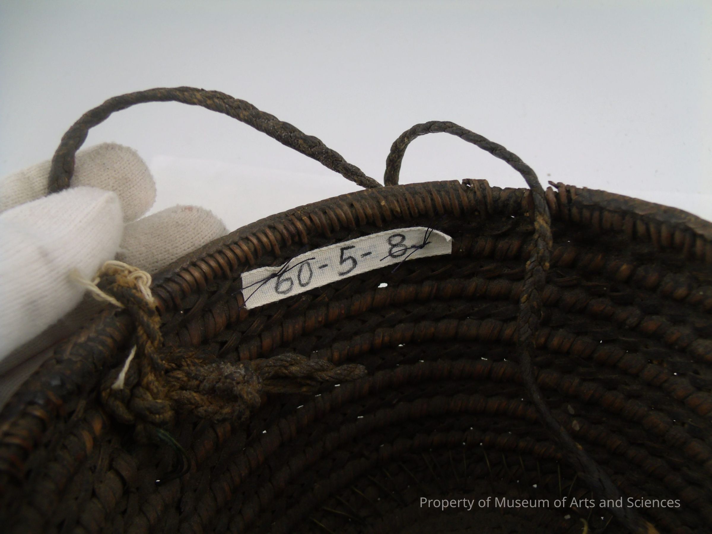 Woven with alternating knotted twist repaired through use of brass wire/Hat has on to a mother of pearl button