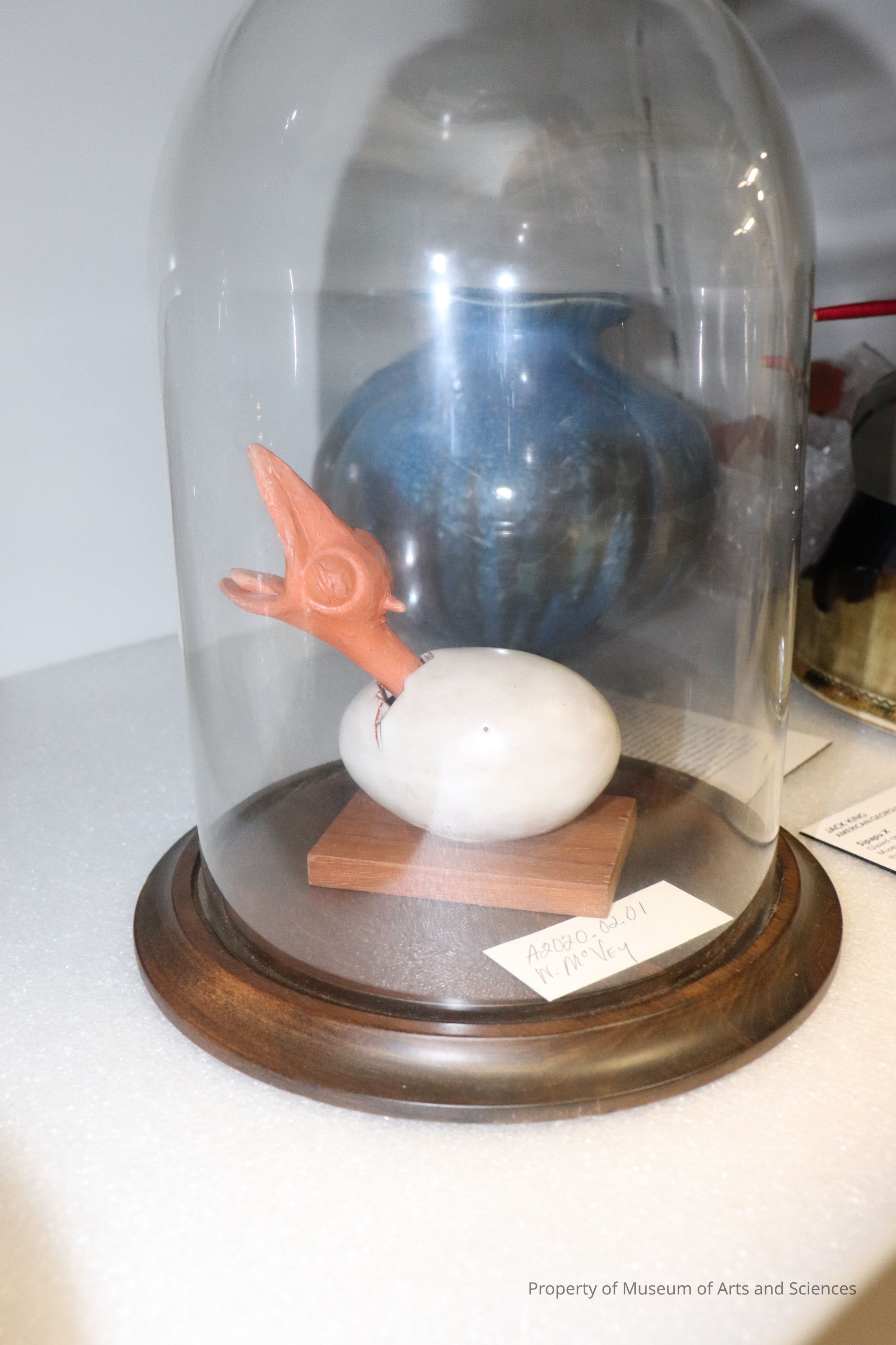 Terracotta bird hatching from egg encased in glass-dome displayCollection