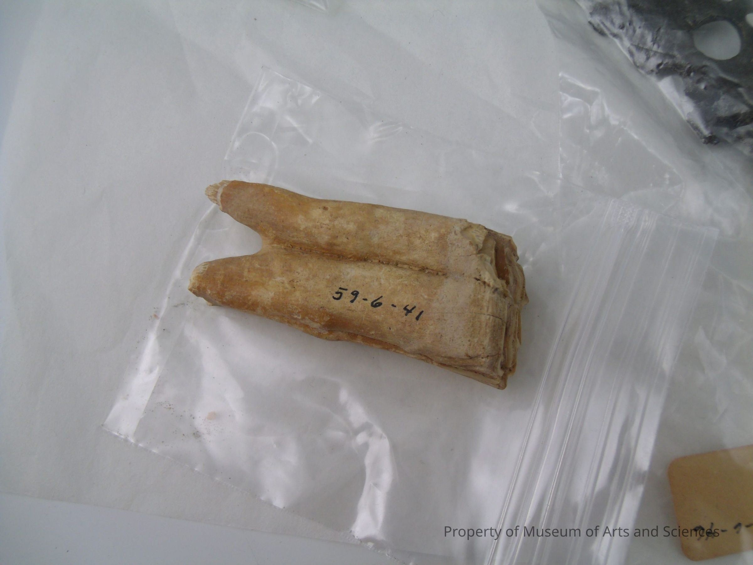 Tooth, horse Horse tooth; double pronged root, chewin edge has circular convolutions, light brown
