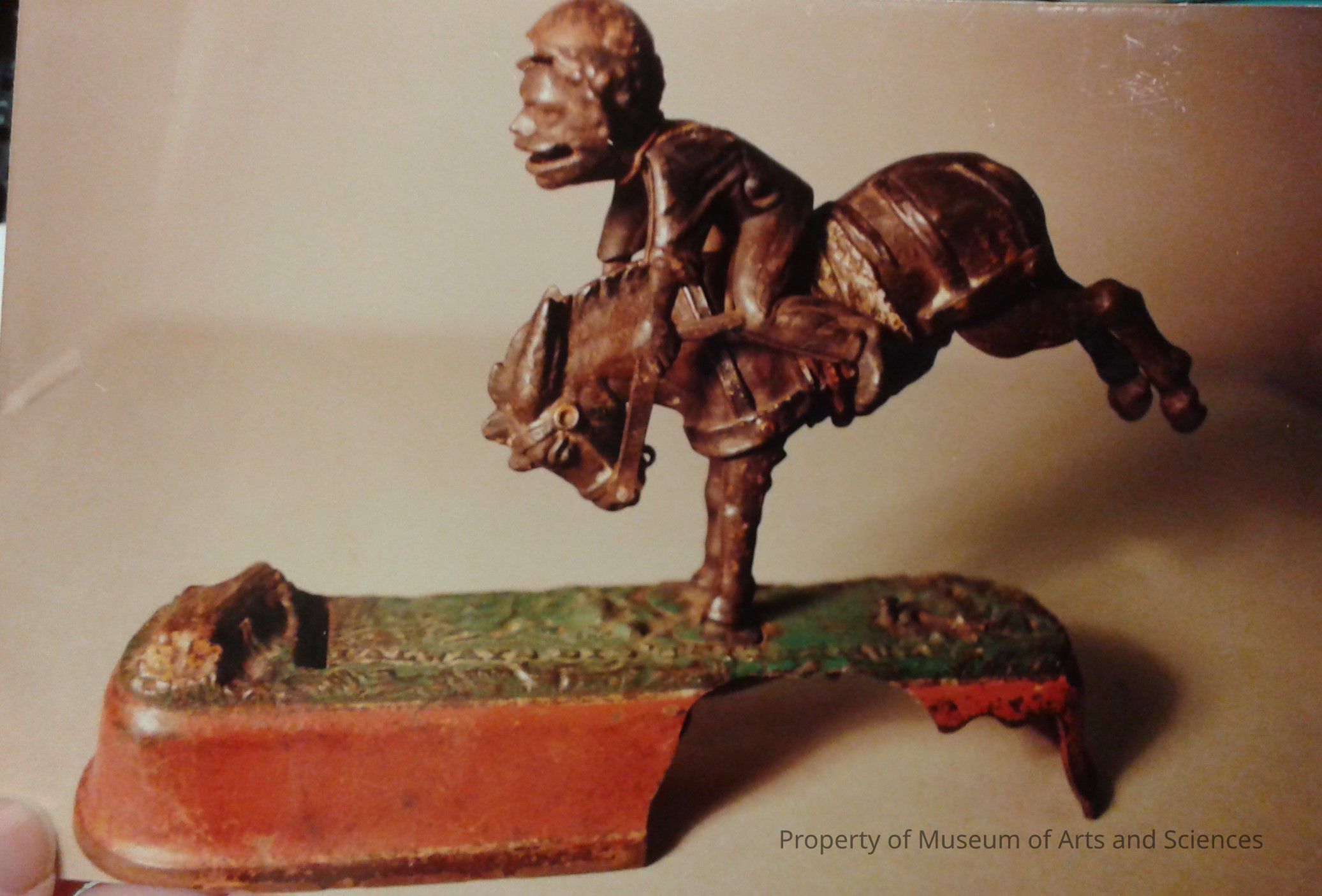 Place a coin in the rider's mouth and push the button (on base); the mule kicks up his hind legs and throws the rider forward. The rider's head strikes the log and the rider to their orginal positions.