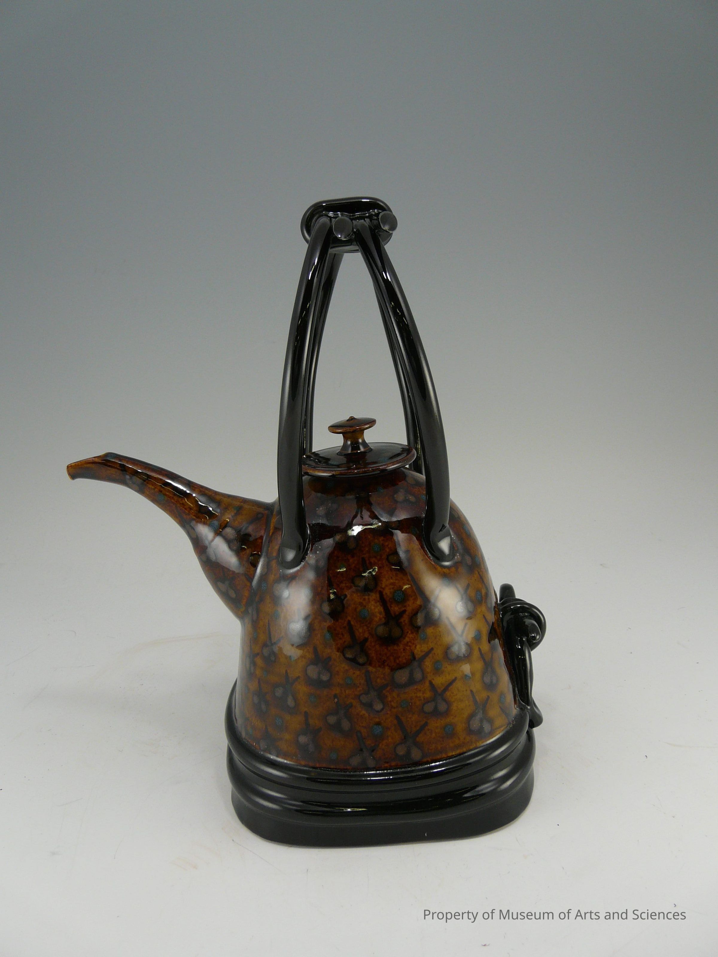 Square based teapot with elongated spout. Deep brown color with tan and gray swirled spots. Base, handles and rear bow are black. Slender handles join together at the top and are bound by reed binding simulated in clay.