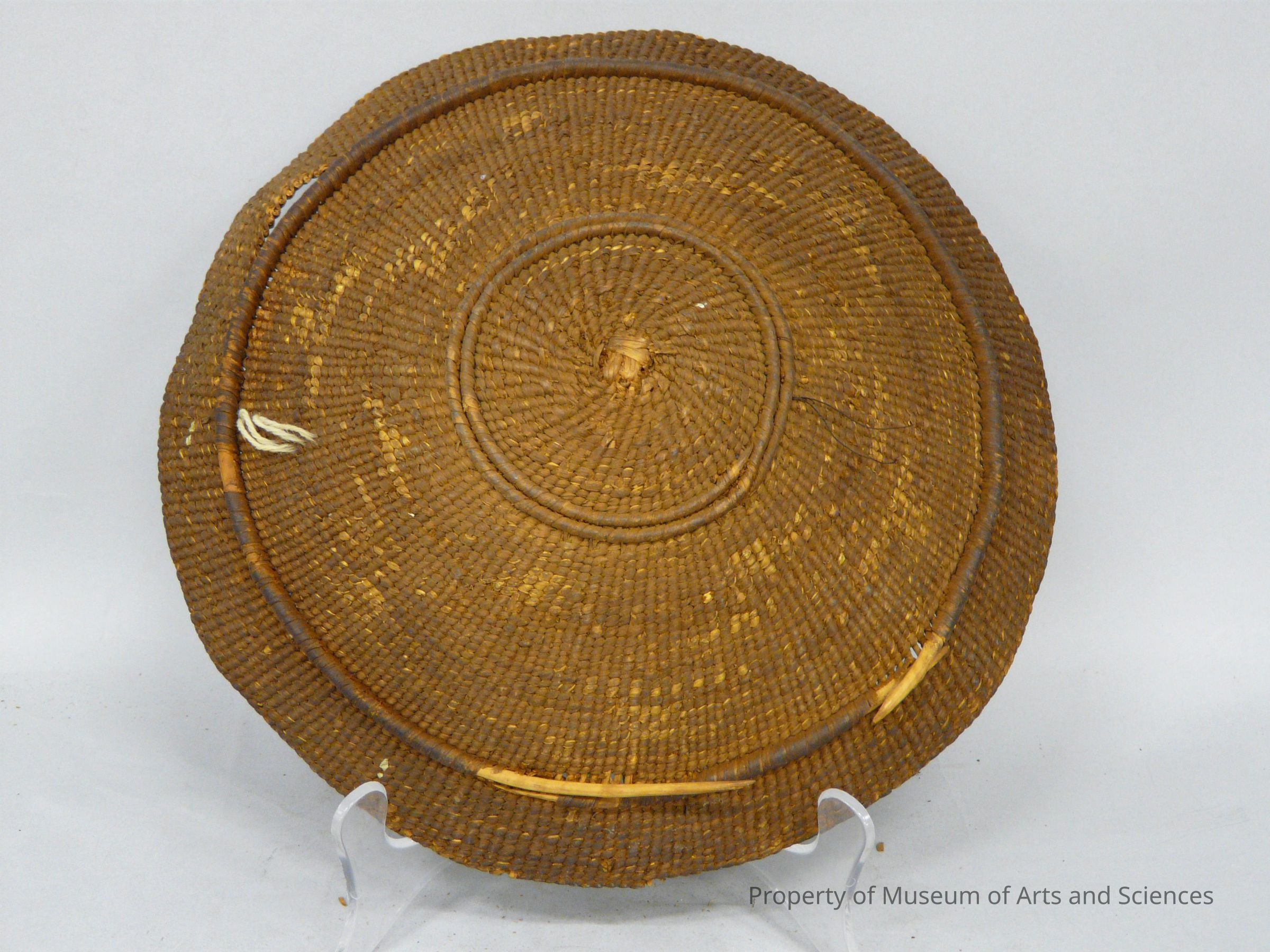 This basket has a wide shallow shape. This type of shallow circular basket was used for serving food. The basket is constructed of tule and dyed tule cordage in contrasting shades of brown in a geometric design.Collection