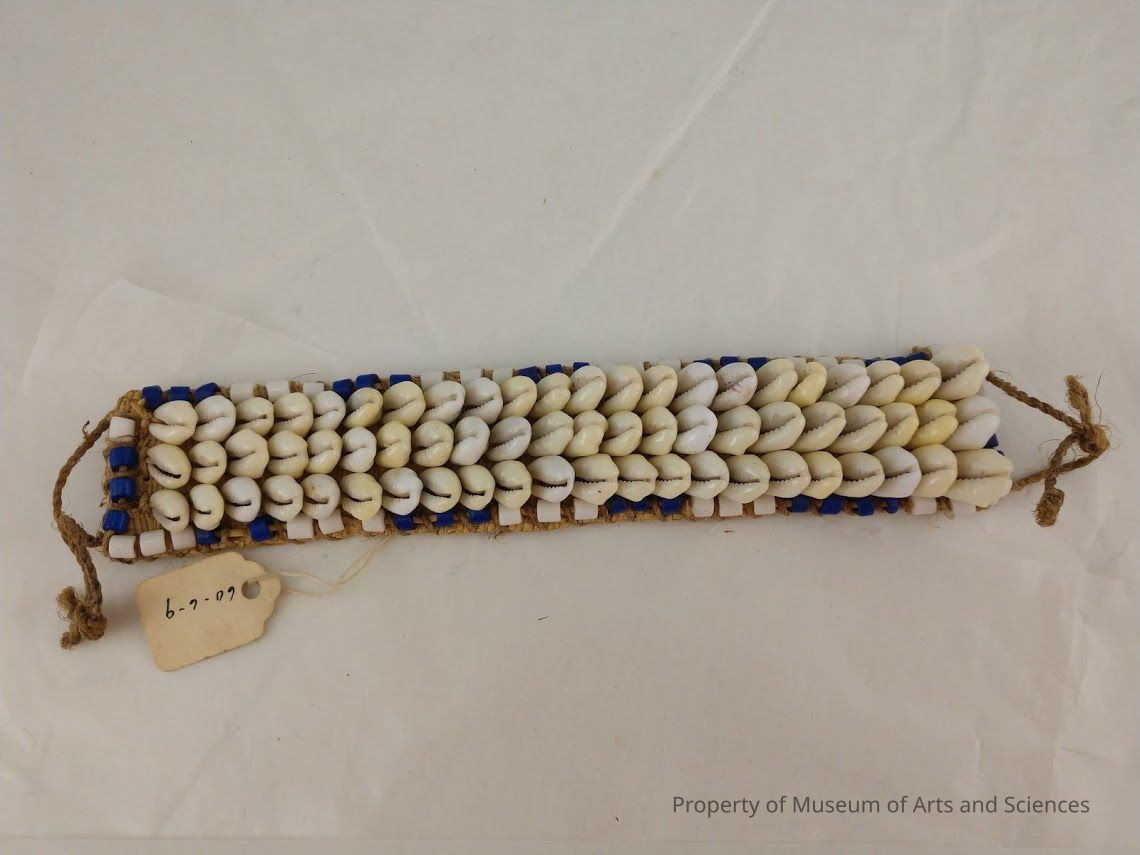 Woven fiber with 3 rows of white shells-and blue heads (bakuba)