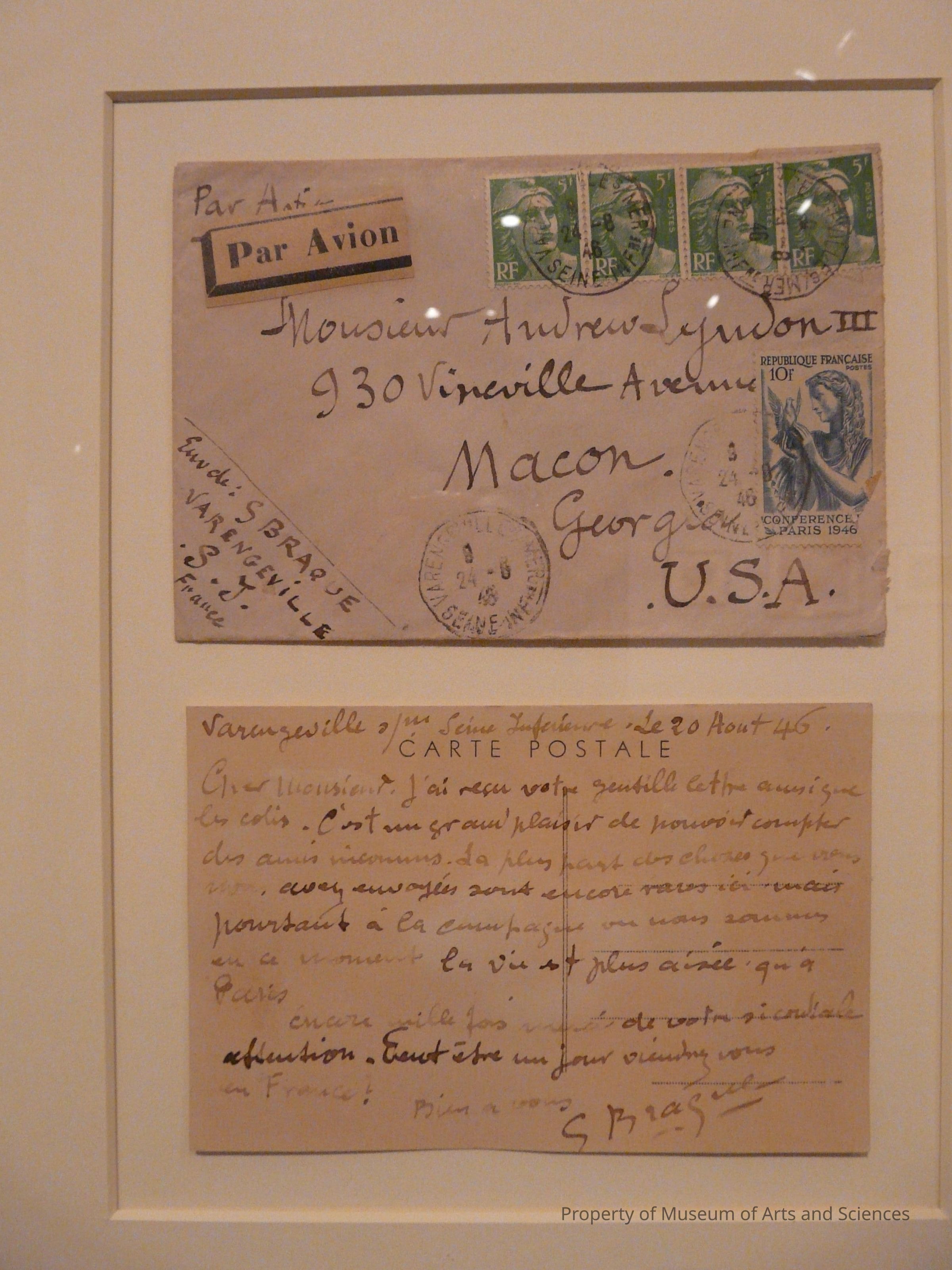Letter with envelope from Georges Braque to Andrew J. Lyndon III or Lyndon the first. Miss type, book says Lyndon?Collection