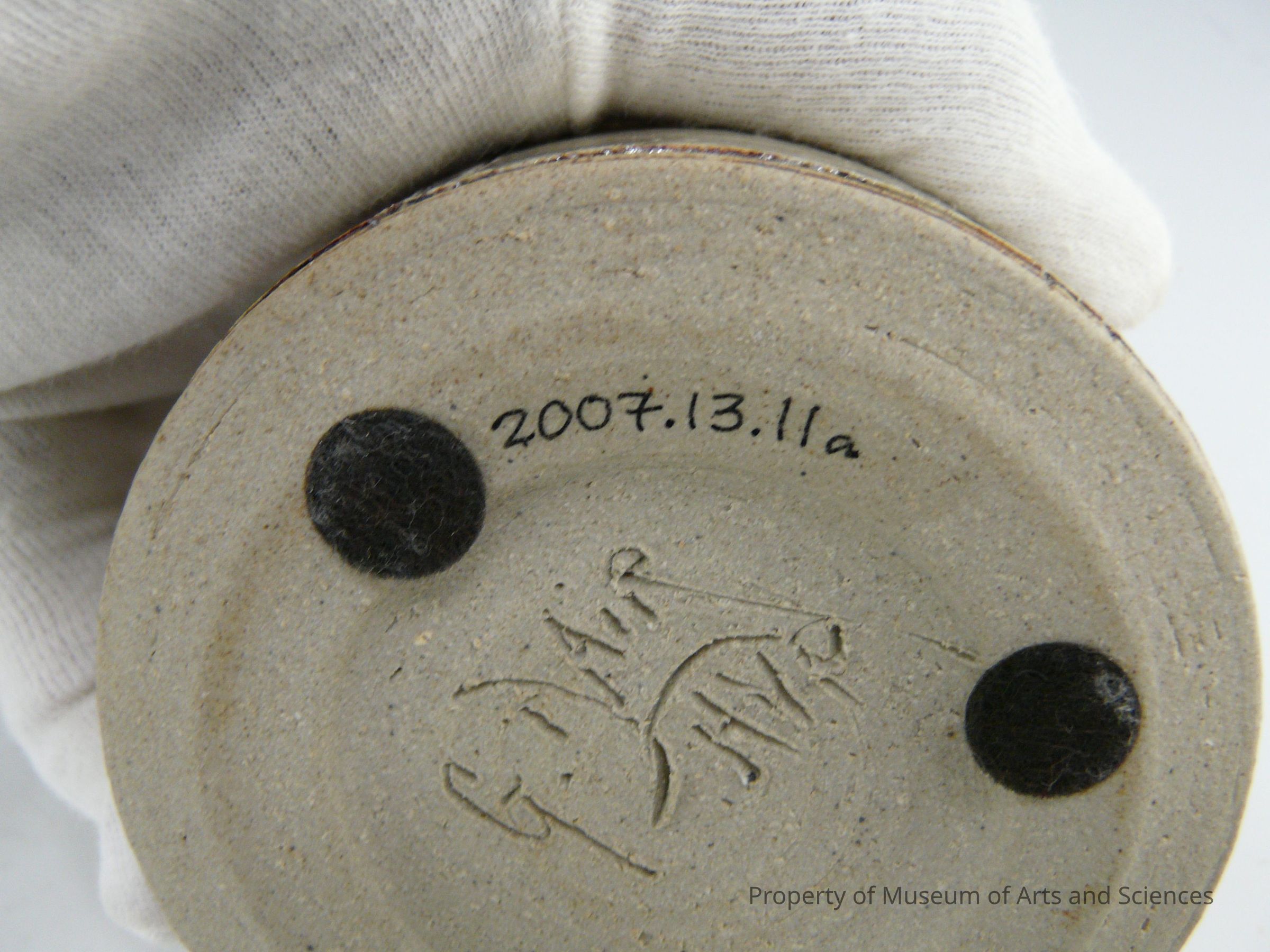 Round container with decorative lid; art drawn into clay on front and back is suggestive of a tree within a circle; tree is glazed white; Lid's handle is a formed piece of clay which suggests a bowing figure on knees with head toCollection