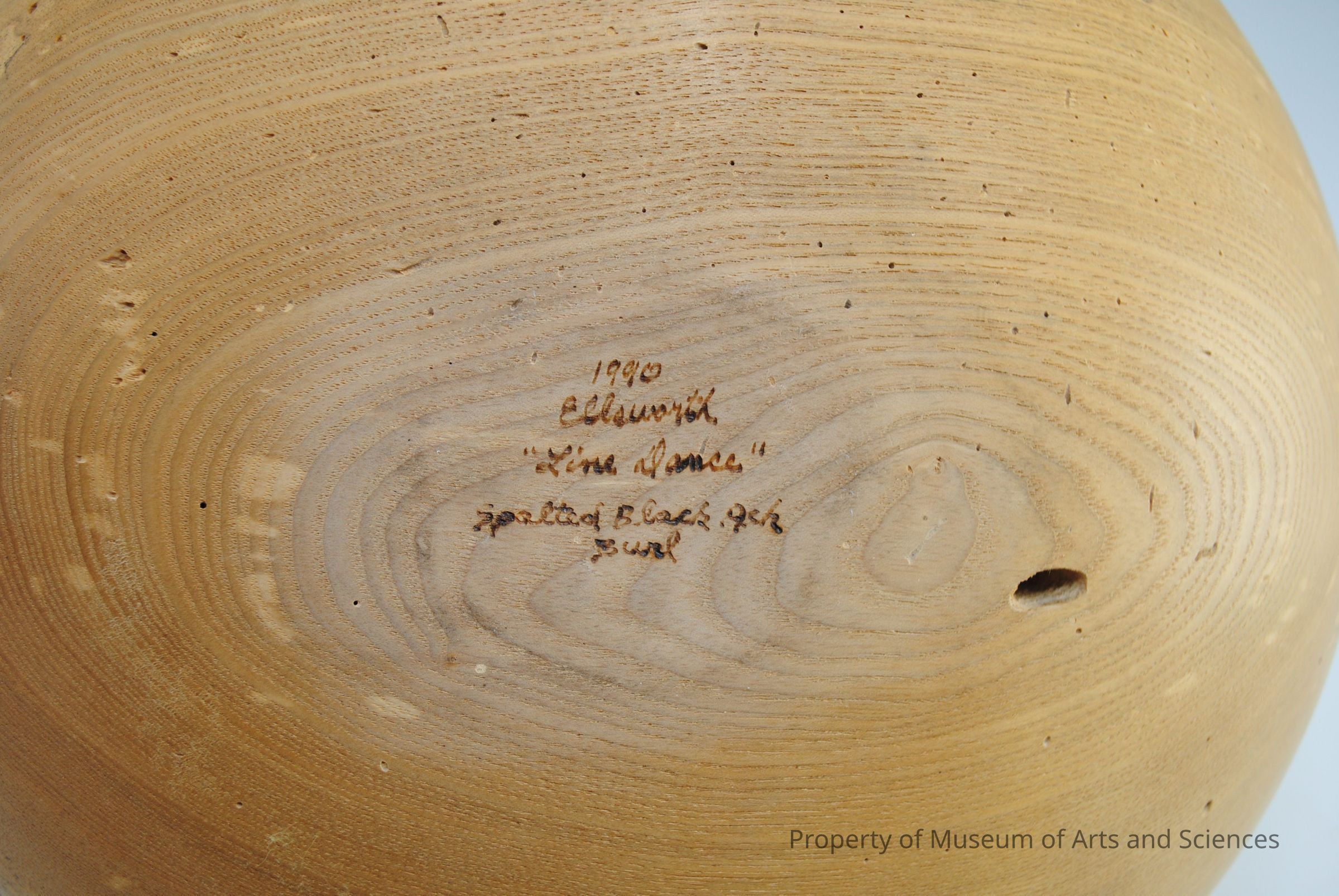 Hand carved spalted black ash burl wood vessel spherical in form with mottled field, natural cleavages darkened for highlight, the top with natural opening. One side has a large triangular opening.Artwork Details