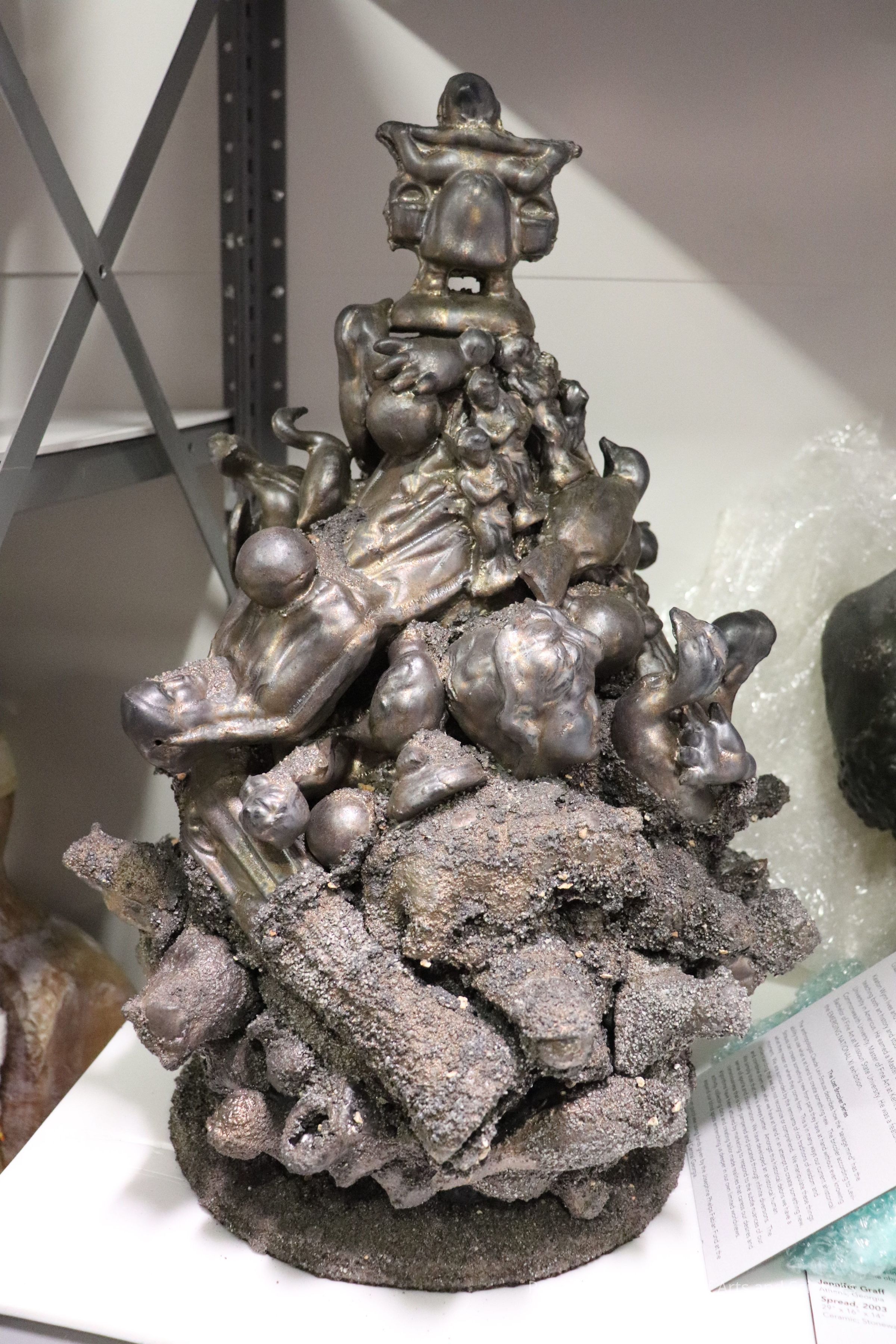 Christmas tree shape sculpture with cast figures imbedded. Sandy texture.Acquisition