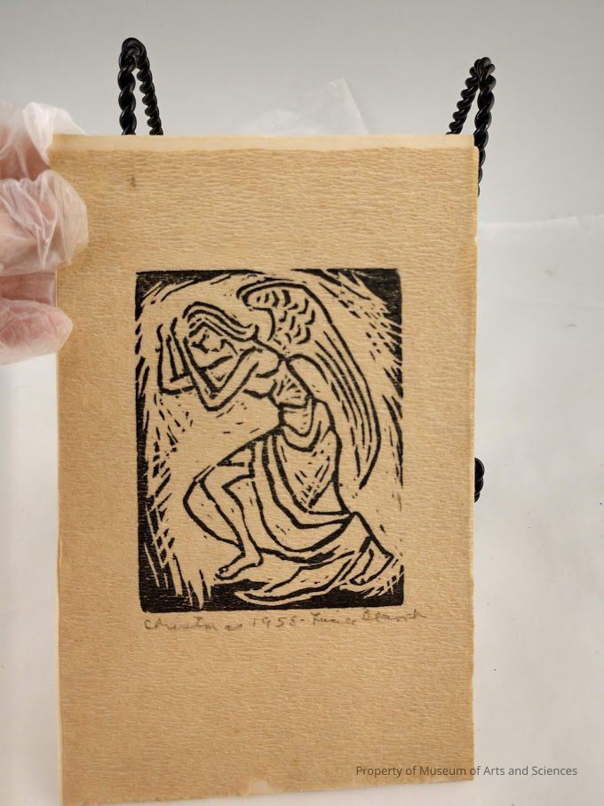 Black ink woodblock print, rectangular of angel bending over to the left with both hands at foreheadCollection