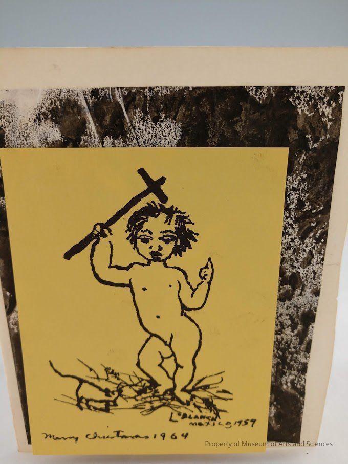Black ink print on yellow paper of standing baby Jesus w cross held aloft in handCollection
