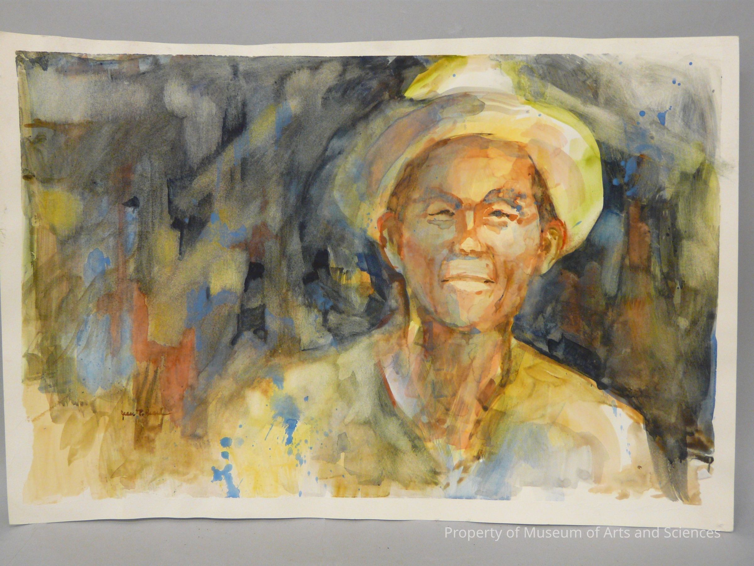 A pleasant-faced man wearing a summer hat is the subject of this watercolor sketch. He looks directly at the viewer, from the viewer's right side of the paper. The painting is almost monochromatic in mostly brown tones with hints of blues and burnt reds.Artwork Details