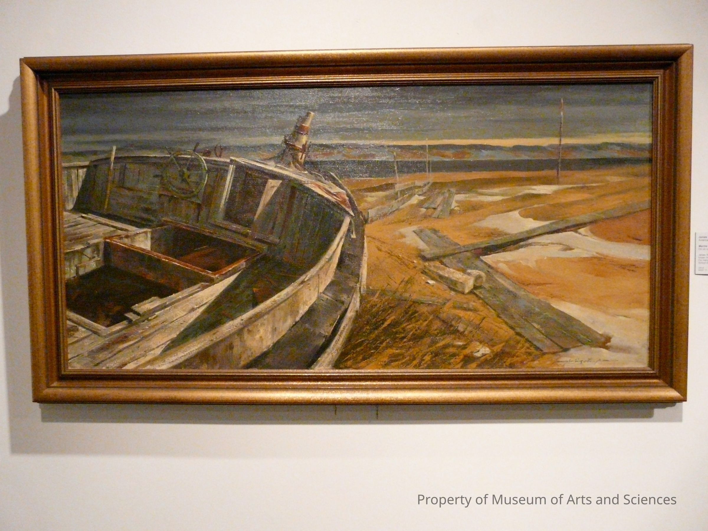 Beach with an abandoned dorie or boat in left foreground. To the right are pieces of lumber from other boats. There are low gray hills in the background that are surmounted by dar lowering clouds; a strip of dark water separates the beach from the hills.