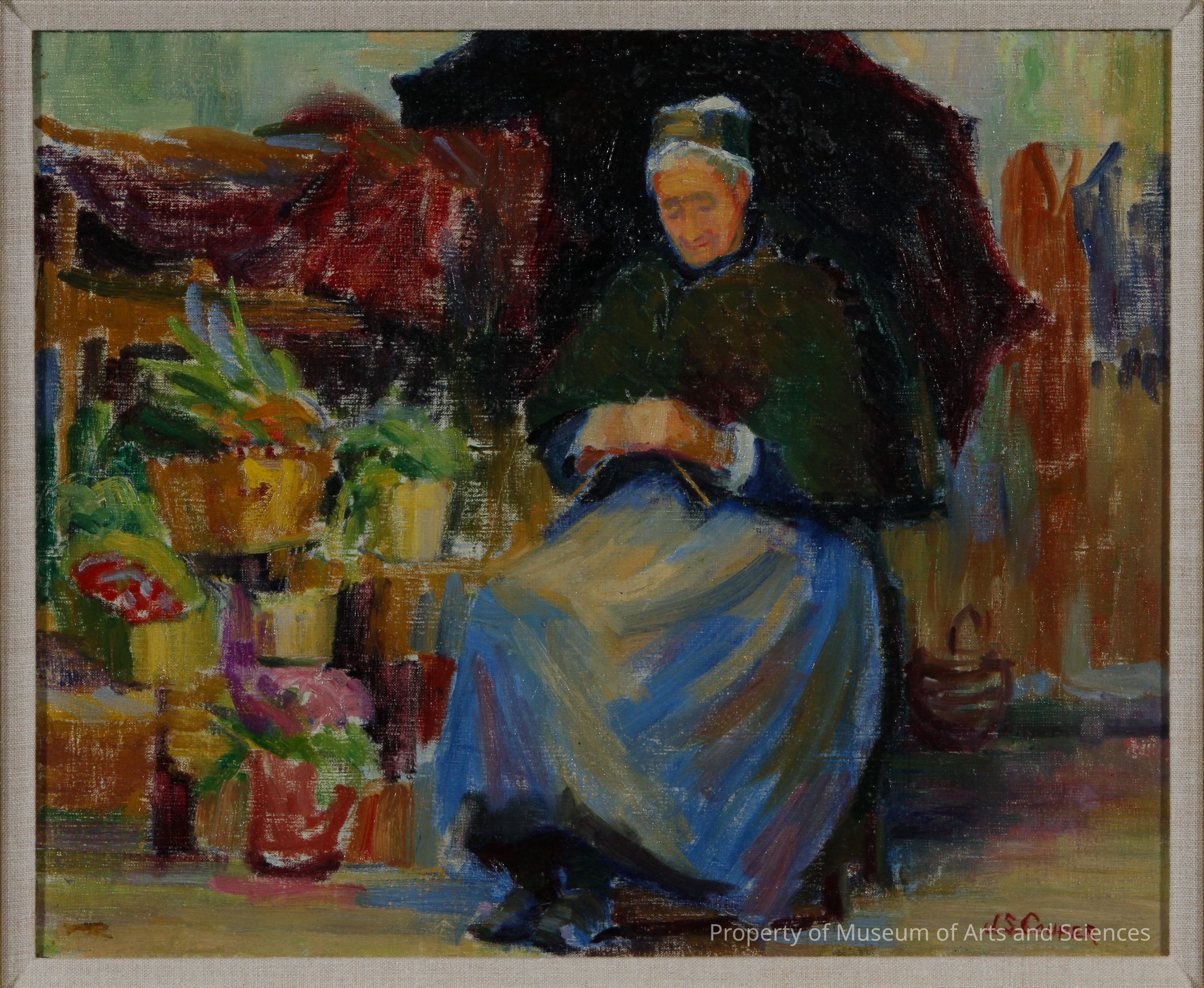 Women under a large umberlla by a vegatable stand- she is knitting. Brightly colored.Artwork Details