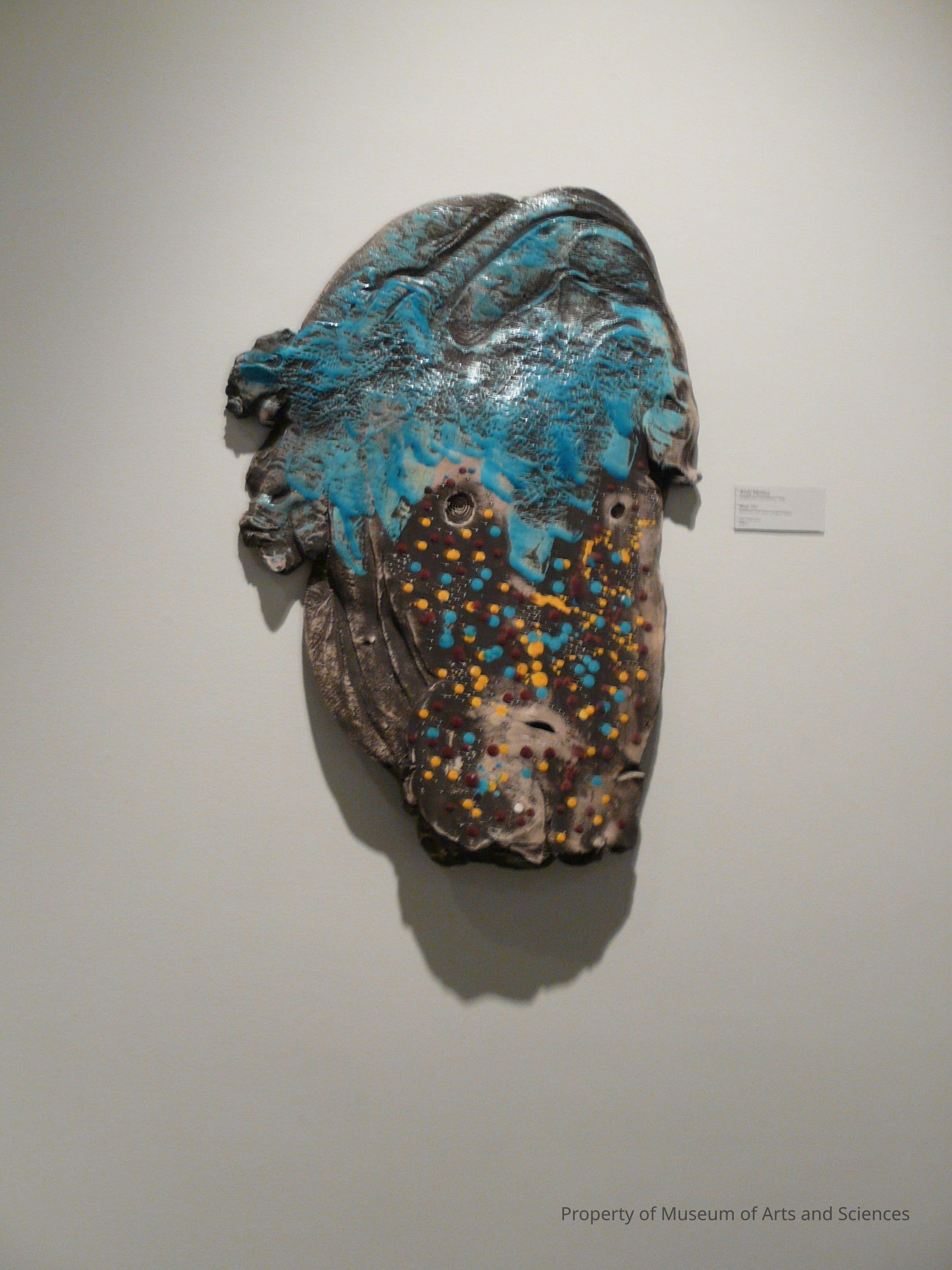 Stoneware Mask with black matte and glossy turquoise glazes incised with stamped designs and other markingsCollection