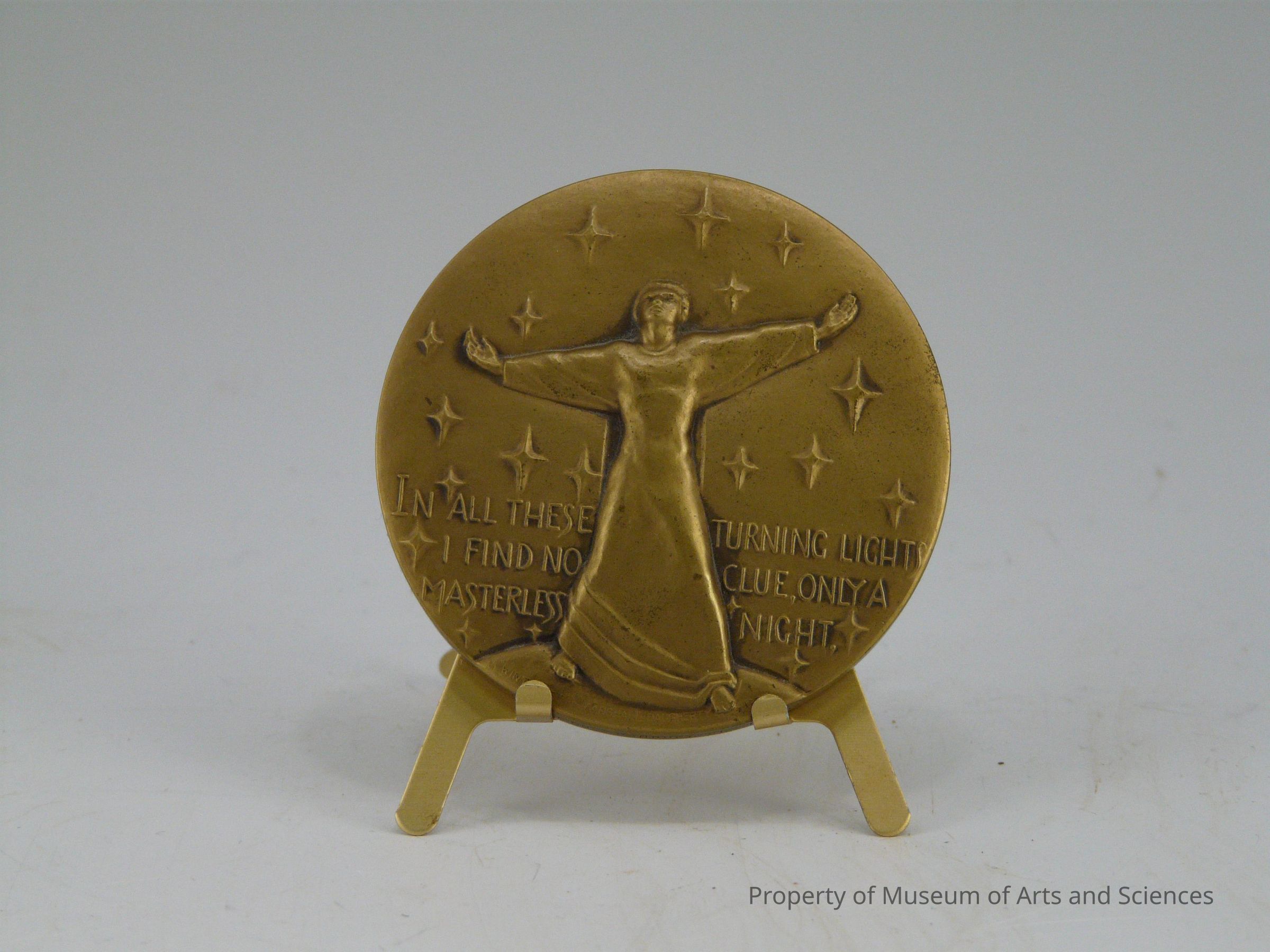 Obverse: standing figure with starts. Inscription: "In all these turning lights I find no clue, only a masterless night." Reverse: crouched figure with inscription "And in My blood no certain answer."Collection